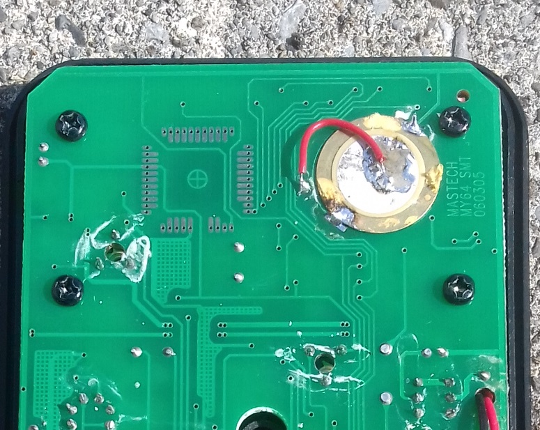 Attached are a couple of photos of the other side. The center of the piezo (red wire in photos in first post) is connected to the small pad above component Q4.