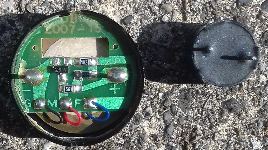 However, I did find a bigger piezo (about 22mm diamter), that I think was pulled off a UPS board, and when I try with this in place of the original piezo, it makes a nice loud noise. But whereas the other piezos are just a piezo, this one that works has some extra circuitry built in (picture 3).