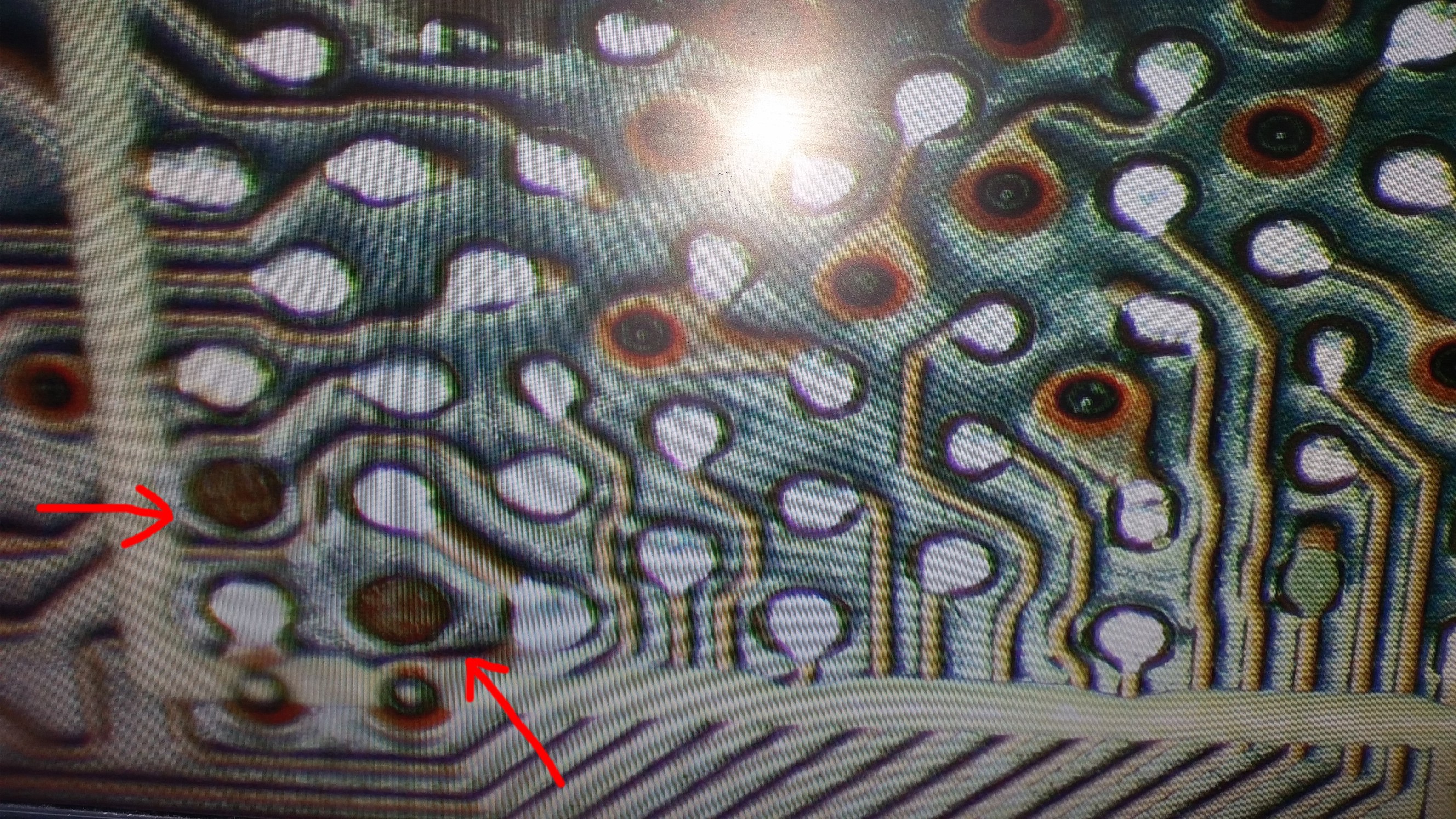 But examining it under the microscope before cleaning I could see that two pads right on one corner of the BGA had come off the PCB (and they were still stuck to the BGA)