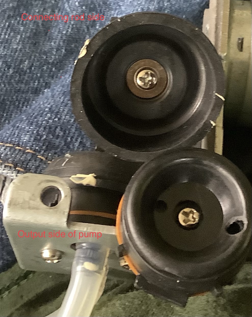 Remove the two outer rubber cups and take the middle screw from the connecting rod that is in between the two cylinders and carefully pull the piston out from cylinder there is a flat washer and rubber “O”ring clean up both of them and put some very light grease on the metal washer and on “O” ring and reassemble the vacuum pump assembly and by hand rotate the connector rod several times to make sure it very easy to turn