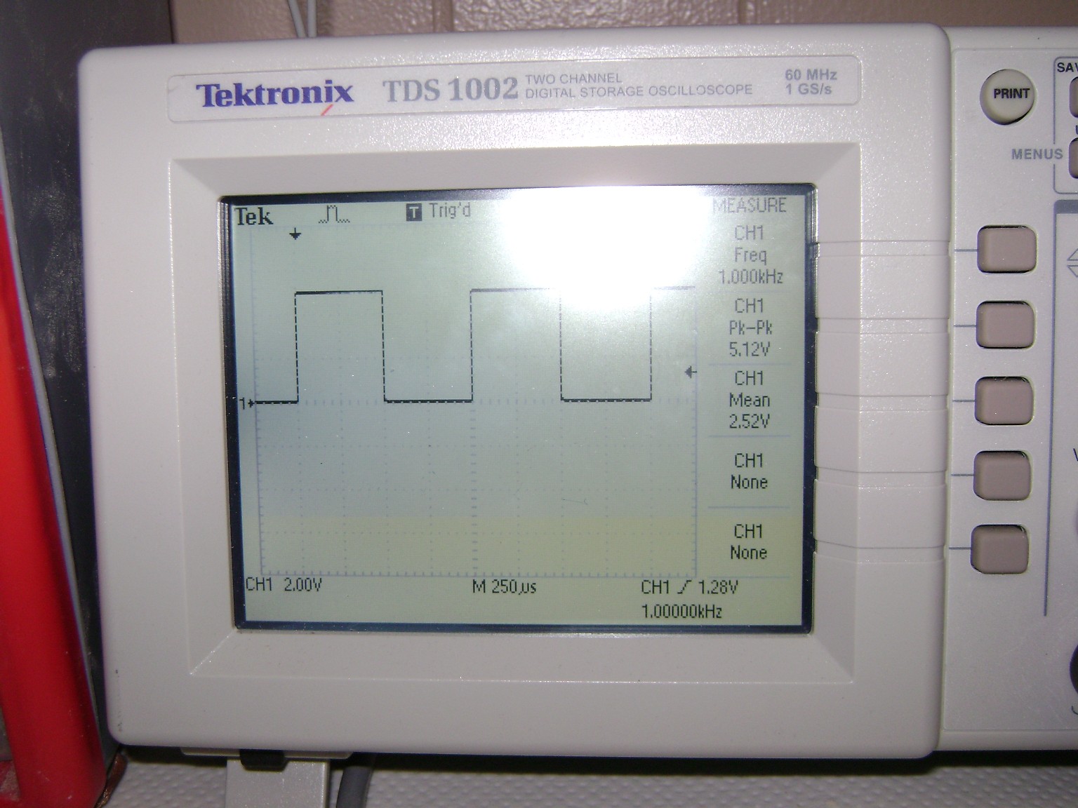 If you were wondering why the verticle edges were faint, the simple answer is: this is perfectly normal for most tube scopes. This is a picture of an LCD scope. You're not doing anything wrong.....yet. Once you smooth out the edges of your calibration square wave, then you'll be ready to move on.