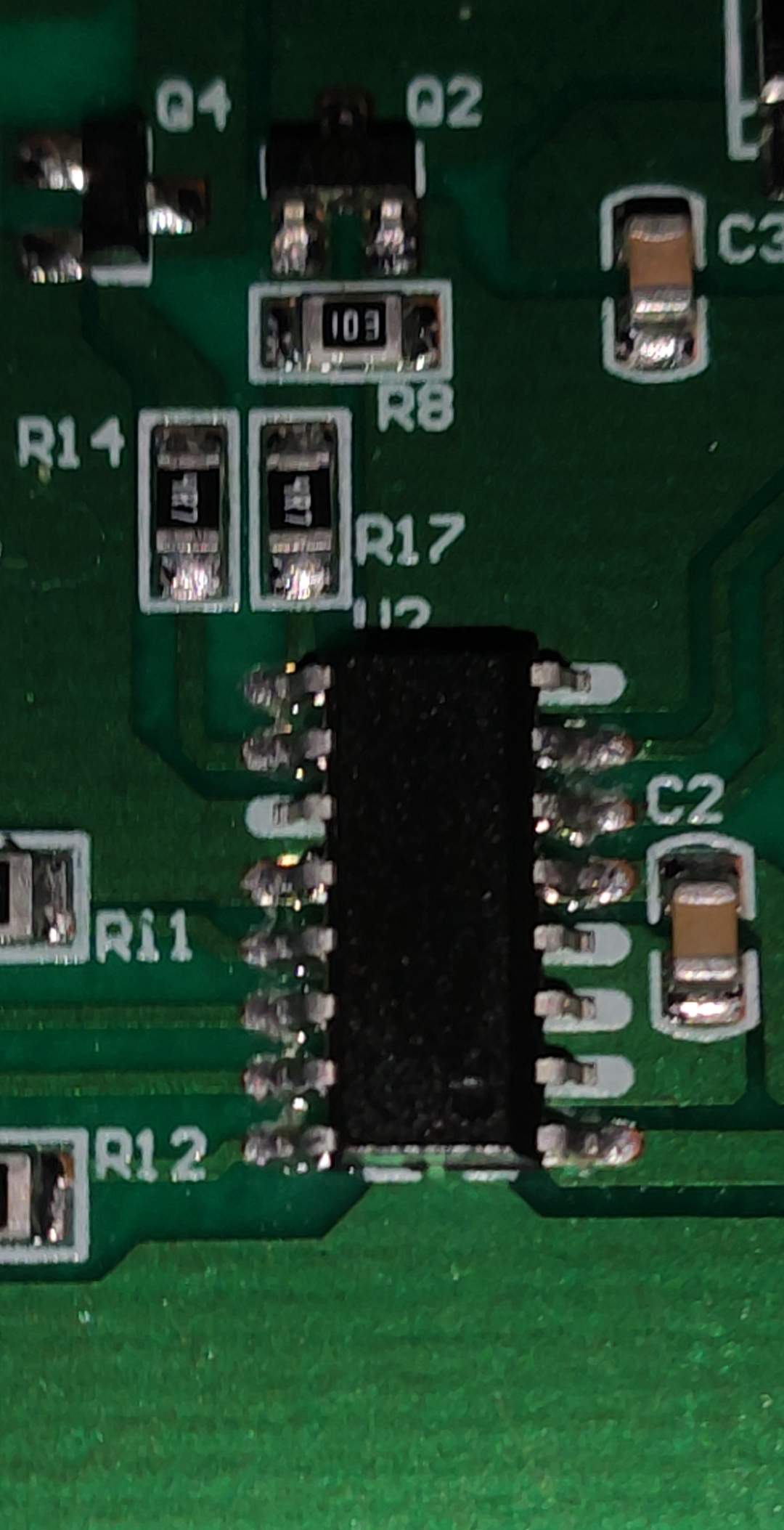 Weird how the IC has a bunch of pins not soldered and sitting on top of silkscreen. Also, the 4R7 seems low for any pin on a SOIC-16.