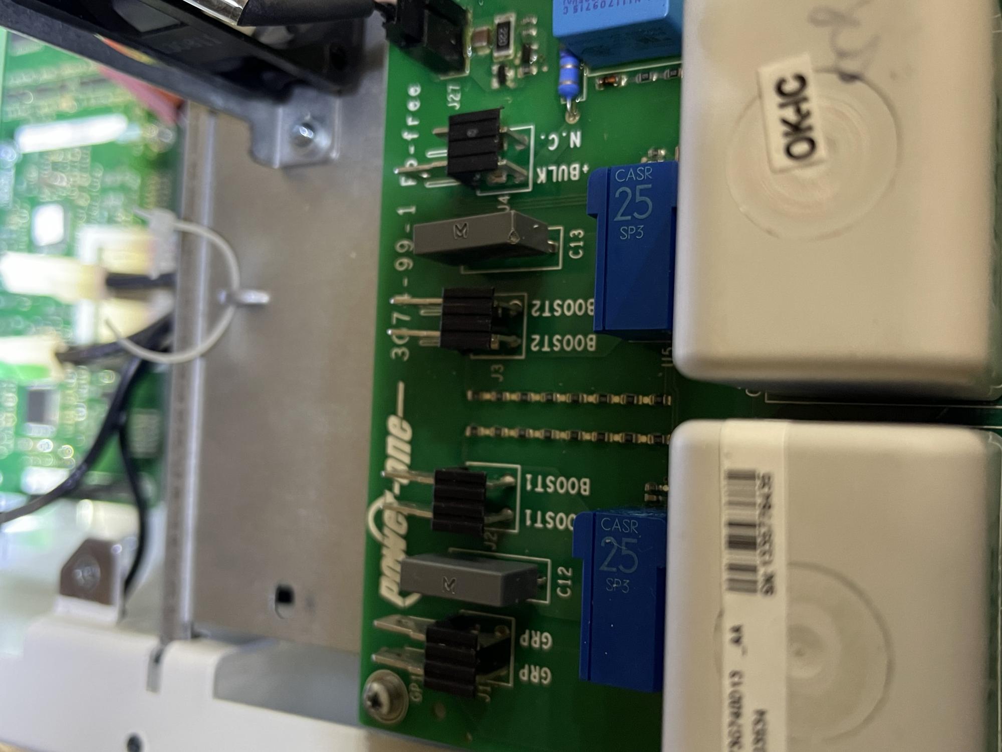The CASR/25/SP3 transformers are measuring the current in one leg of each PV circuit. Ground fault detection requires that the differential current be sensed, ie we must sense the current in both legs. Therefore we must look for a detector on the PCB that has the bulk capacitors. This detector must be connected to BOOST1, BOOST2 and GRP.