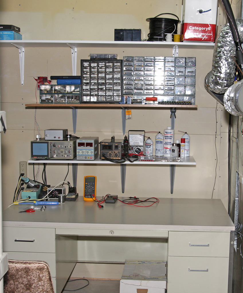 My work station/bench is in my room (where I also sleep). Like retiredcaps, I don't do many repairs so it's not such a bad thing. I have a small wooden bench/table by the window where I keep my tools and soldering iron - it's nice and bright there. No chair either - I just sit on the floor (got a soft carpet). Surprisingly, I have found that sitting on the floor is a lot better for my back than sitting in front of a desk. In fact, I don't get any back pain at all when sitting on the floor. The only thing I have to do is stand up once in a while to stretch my feet so they don't fall asleep.