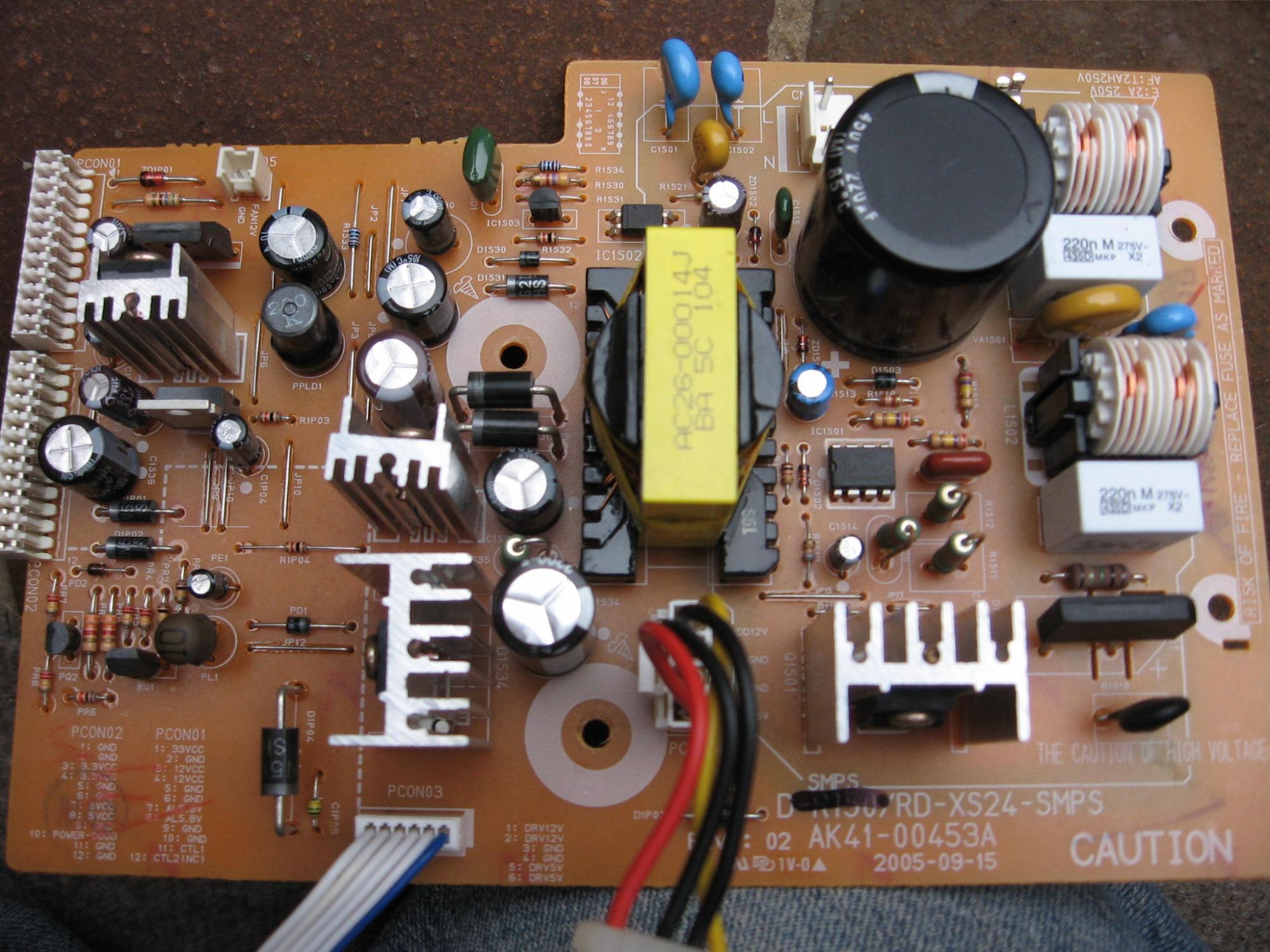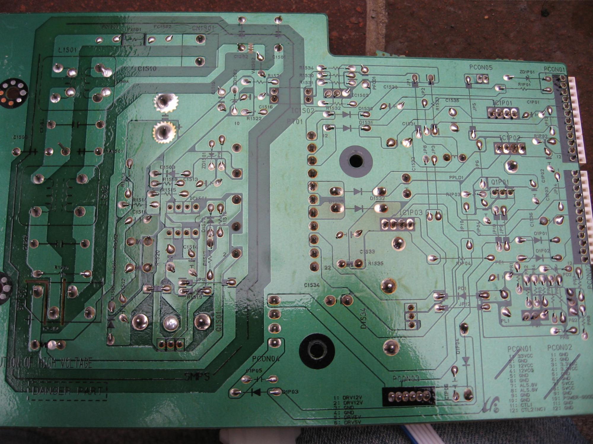 I found the service manual online. I've attached the schematic for the power board, as I'm thinking the problem may lie there. The troubleshooter in the manual begins with saying PCON 2 - Pin 10 should be high, and if it's not, to check the fuse. Fuse is ok. I checked the pin 10 with a logic probe, and the pin was fluctuating high and low. Similar with a voltmeter.