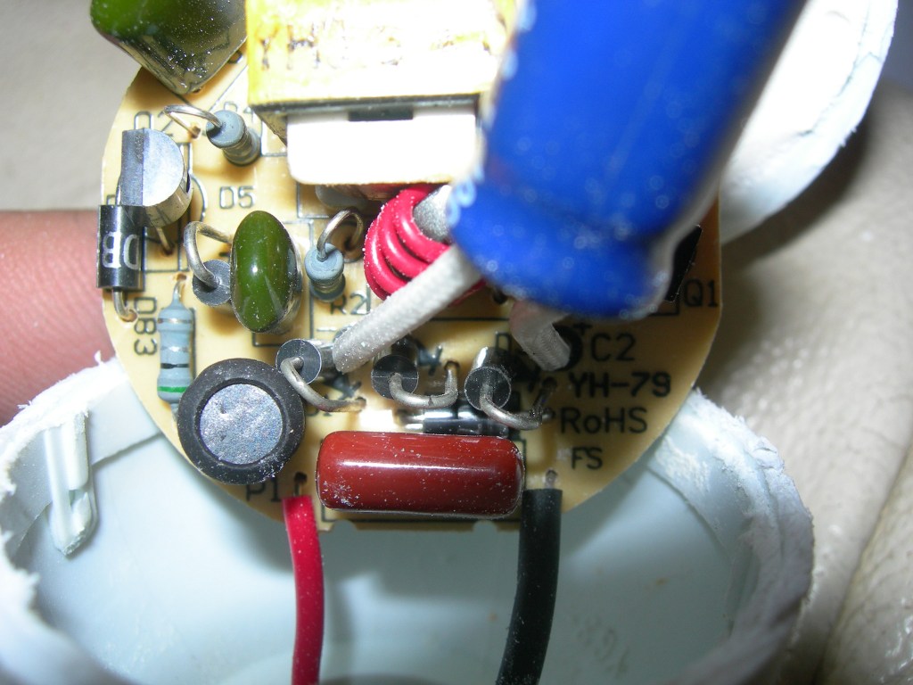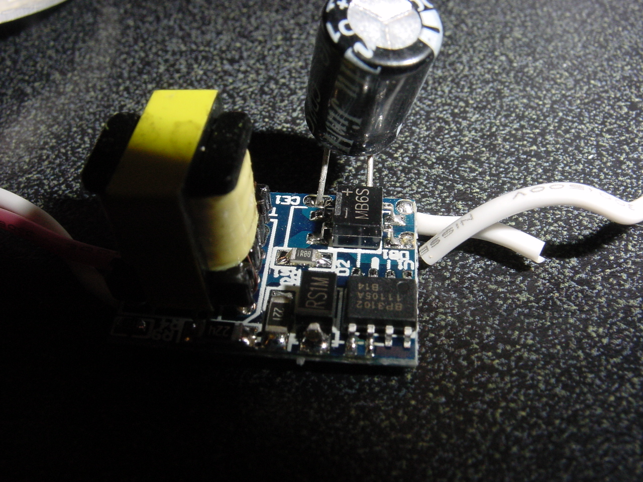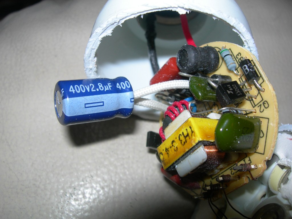 - It uses a 2.8uF cap. No, that's not a typo - not 2.7uF. The manufacturer obviously was too cheap to use 3.3uF. At least they use a 400V cap - I've seen a few bulbs using 350V caps, which sounds "okay" until you work out that the maximum voltage in the UK allowed is 253V which gives 357V rectified, which is exceeding the cap ratings. I've seen 251V from the socket here. Cap is an Aishu, I've seen this brand in some cheap TVs.