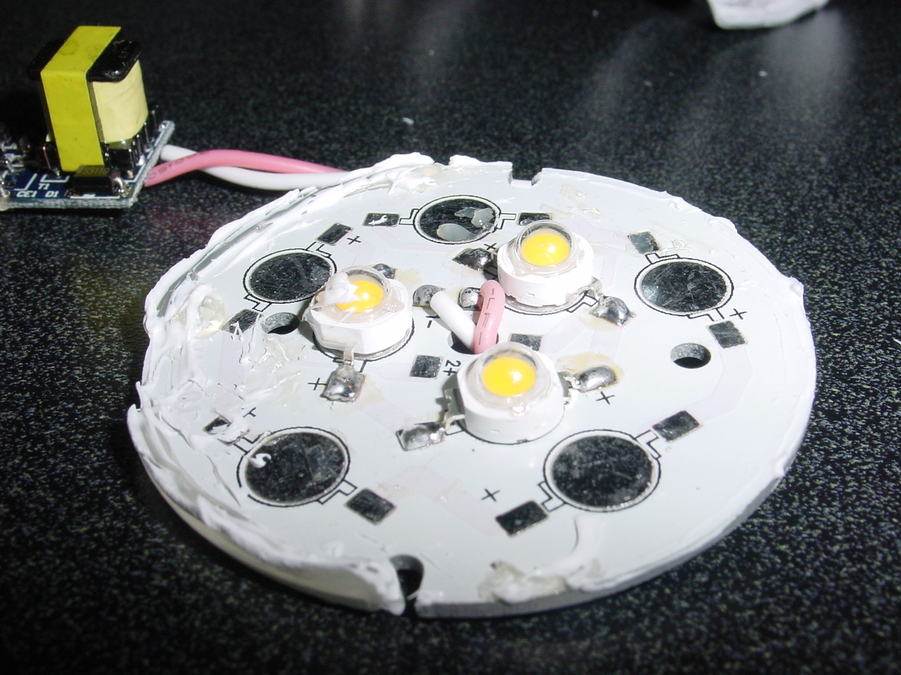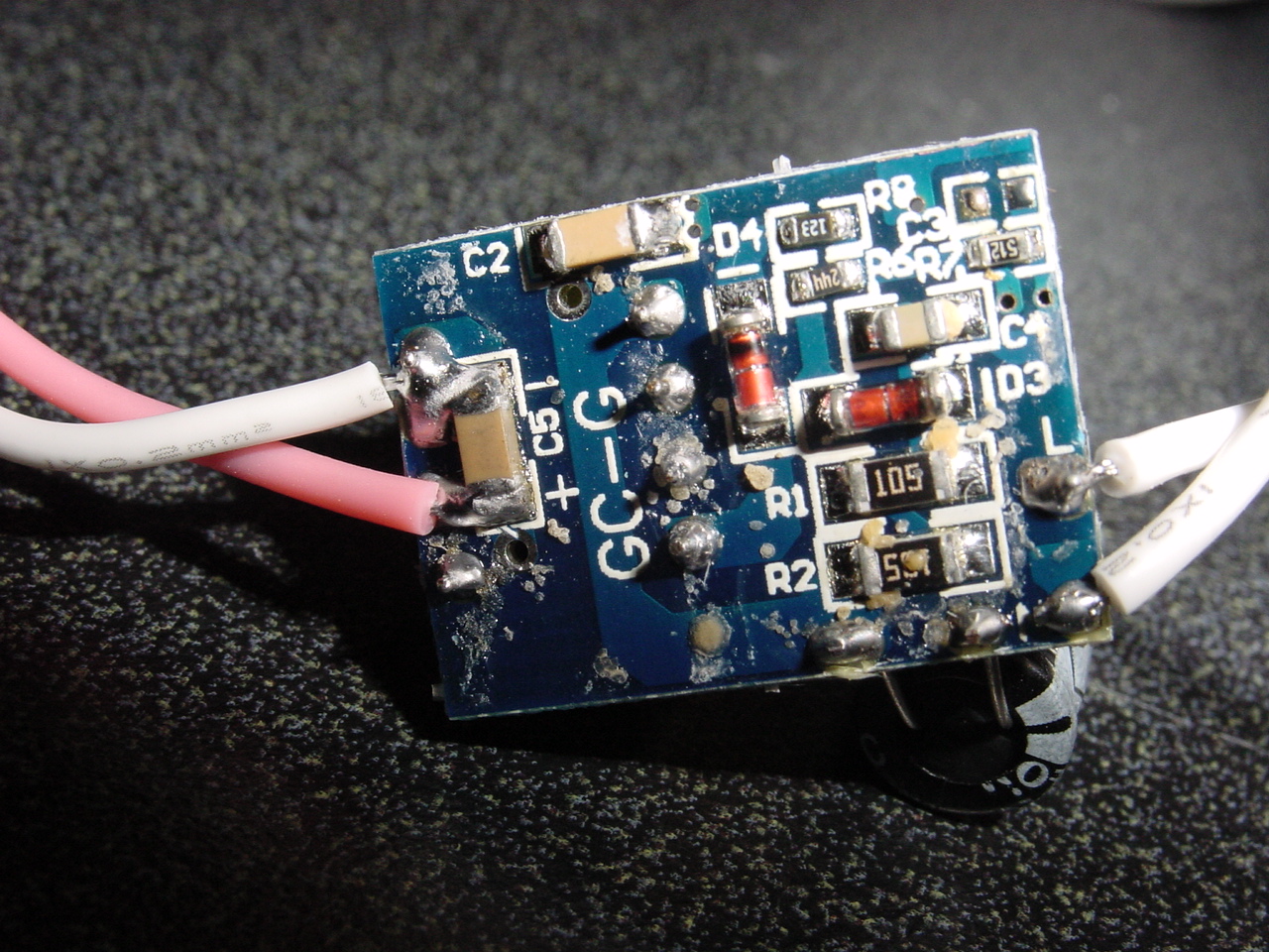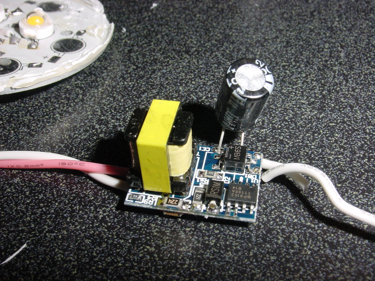- It uses a 2.8uF cap. No, that's not a typo - not 2.7uF. The manufacturer obviously was too cheap to use 3.3uF. At least they use a 400V cap - I've seen a few bulbs using 350V caps, which sounds "okay" until you work out that the maximum voltage in the UK allowed is 253V which gives 357V rectified, which is exceeding the cap ratings. I've seen 251V from the socket here. Cap is an Aishu, I've seen this brand in some cheap TVs.