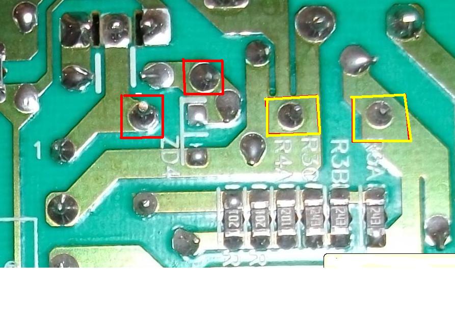 Can you check the ones I have marked and if they look at all bad resolder them. Are the yellow ones the main cap? ( My top to bottom geography is not good)
