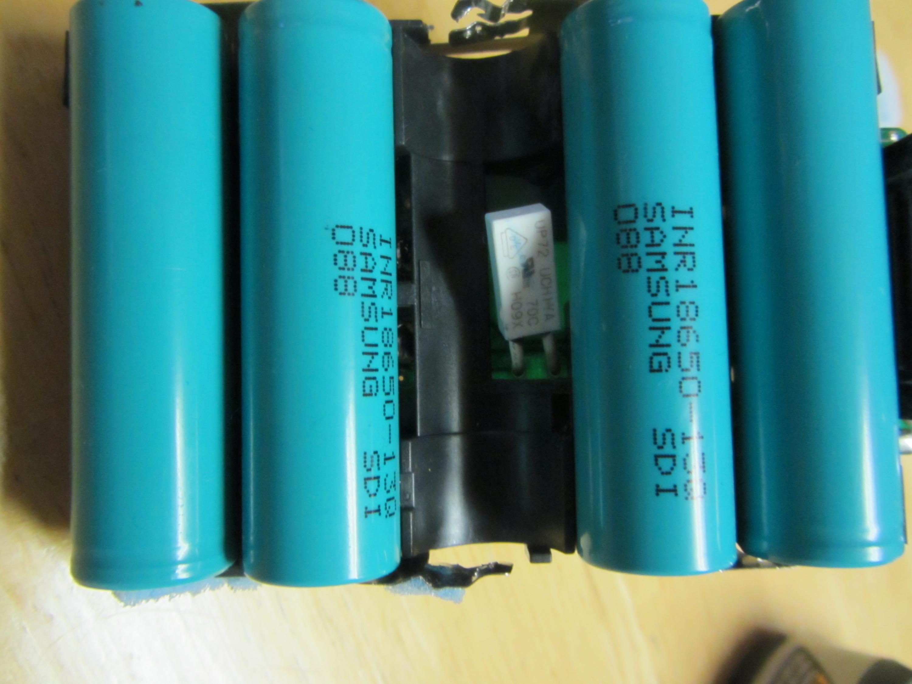 I did a little testing with my drill put some real torque on it and the exterior plastic casing after holding the chuck on drill got mighty hot 125 degrees F so I'm thinking it may just be best to replace the thermostat rather than jumper the battery bank... To the battery output I can see there is an inherent danger not letting the pack run as it is supposed to through the board.