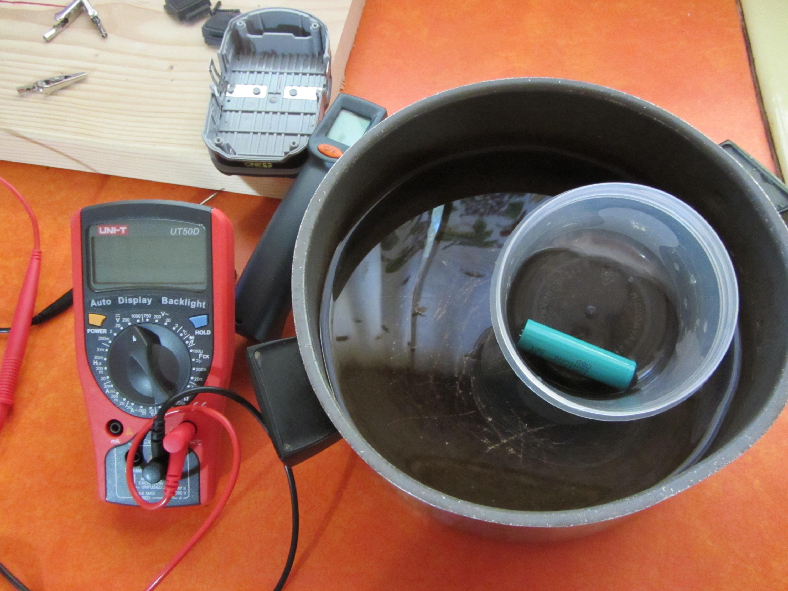 sitting in a small bowl inside a larger stainless steel bowl of water for safety. This way if it gets hot enough to melt the plastic bowl it will fall into the larger stainless steel bowl filled with water to instantly bring a cooling effect to the cell...
