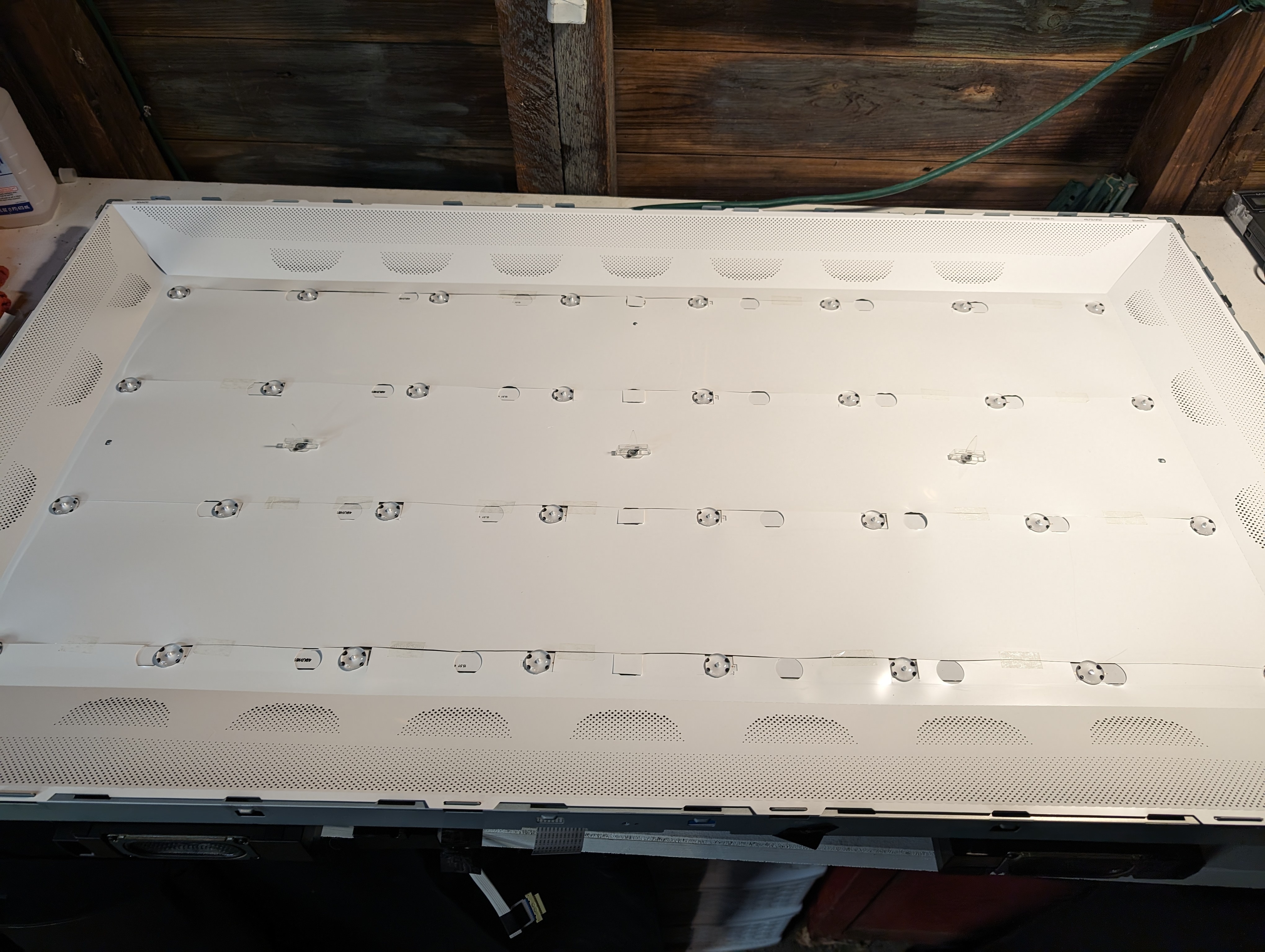 The number of LEDs per pair is the same between both "versions" of strips, however the length of side A in proportion to side B was different, and the spacing between LEDs was different. Thus, the reflector DID NOT line up with the replacements. So, having no other viable options, I decided to cut straight across the punch outs, cut out where the new LEDs needed to be, and then taped it up roughly as to try and not have large gaps or bumps casting shadows. I also used some of the little squares I cut out to cover the middle connectors. The end result looks quite Frankensteined BUT I see no visible signs of refraction, shadows, or spots in the image.