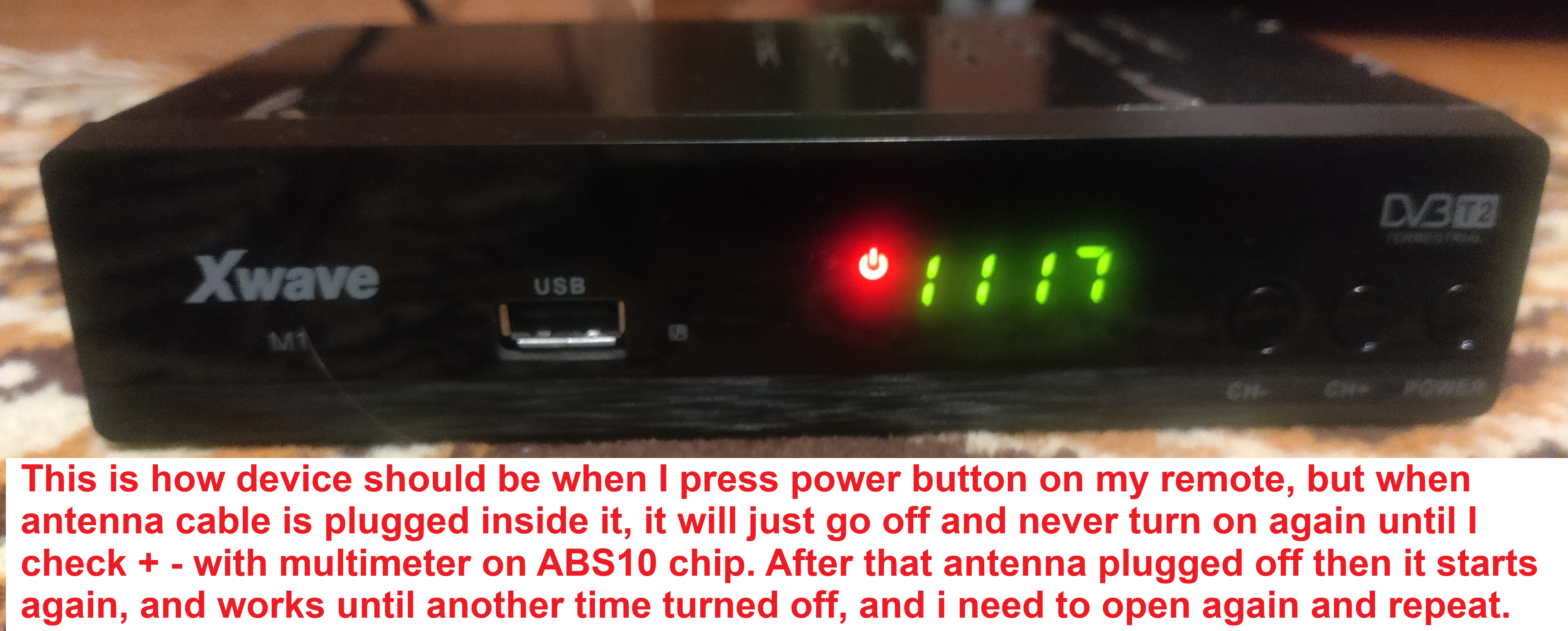 I have two TV devices connected on this antenna, on both it works perfectly only issue is that this set-top-box is not listening when you want to turn it ON/OFF with antenna inside, you need to switch it on while everything is unplugged, after that you insert antenna cable and it will work fine yeah, but if you power it off with antenna cable inside, it will just turn off and not turn on again, until you check ABS10 chip with multimeter like in first picture, then somehow it heavenly unstuck itself and you can turn device on while antenna rf cable is not plugged in, and it will work, until process is repeated again, if its turned off while antenna is inside, it will not work again and need to re-do everything from beginning, its usable not ideal but usable device.