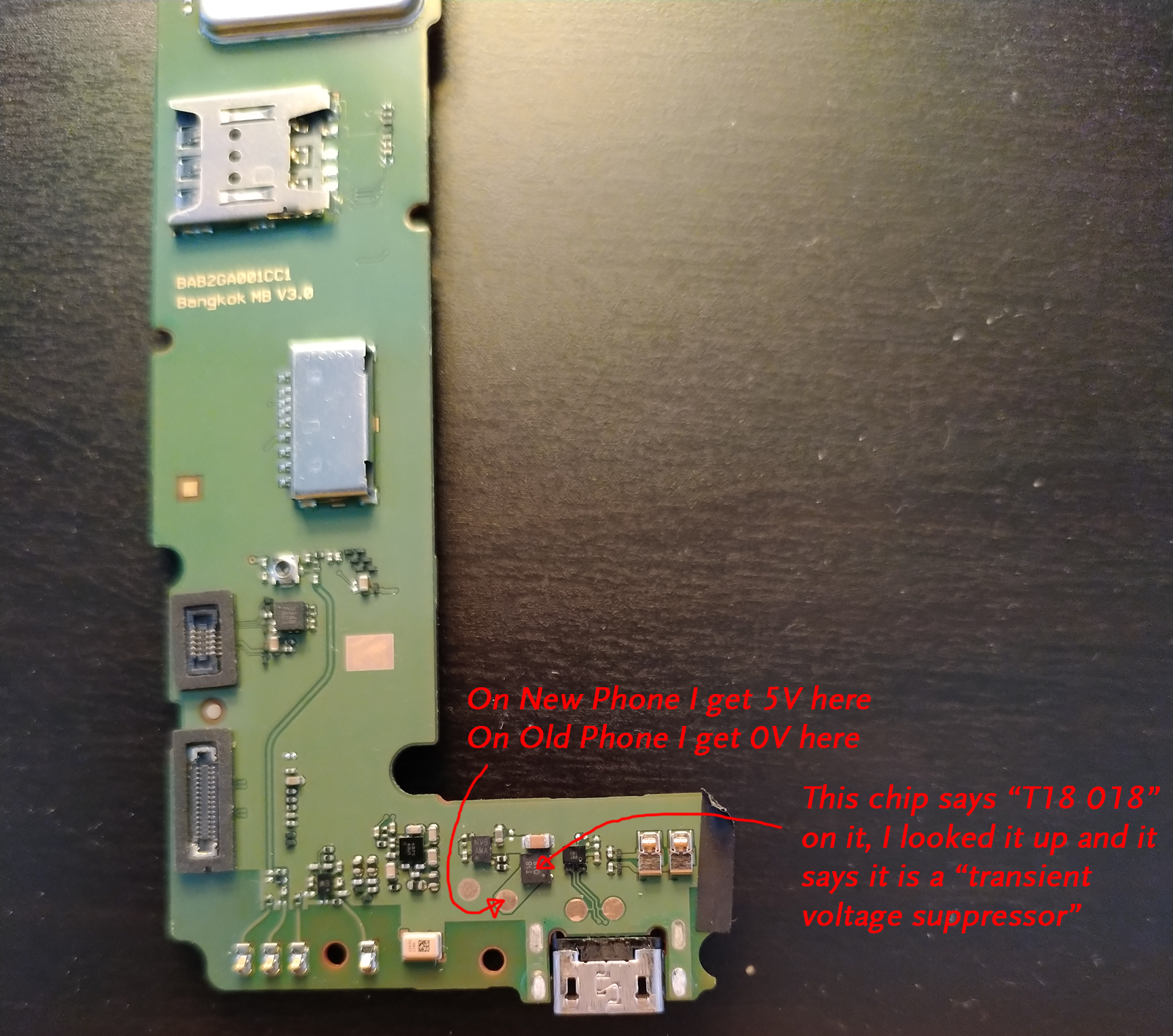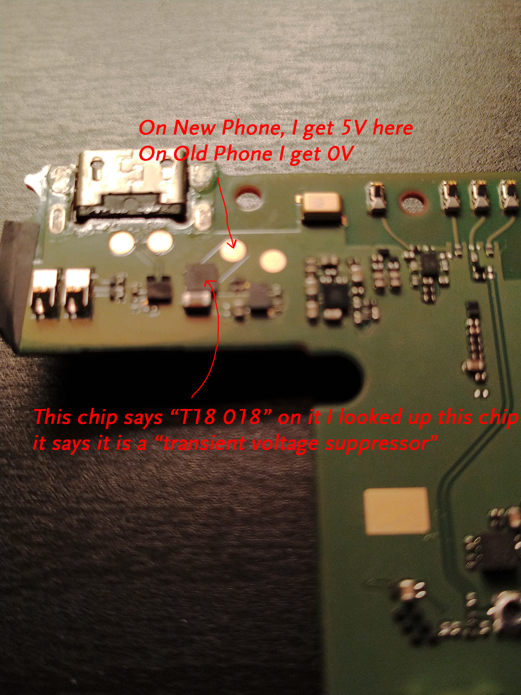 The way the phone is designed is that the USB port is on one side of the board, but all the component are on the opposite side. The opposite side has test points corresponding to the USB pins. I checked voltages on the test pads, and on New Phone, I found 5V on one of the pads (See Pic). On Old Phone, 0V.