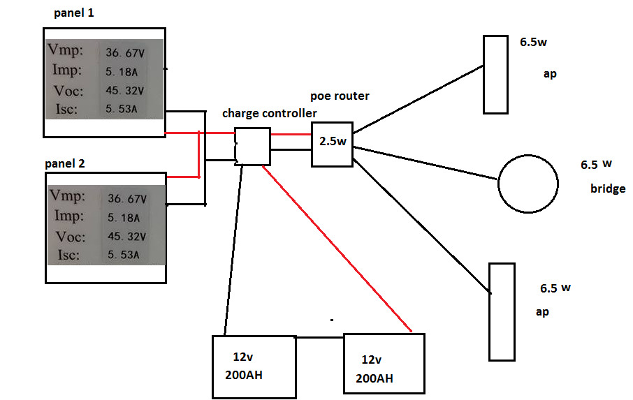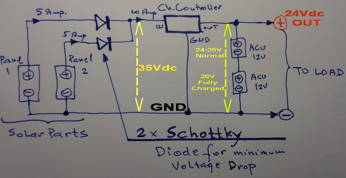 We have two 24v solar panels rated at 190 Watts each in parallel.