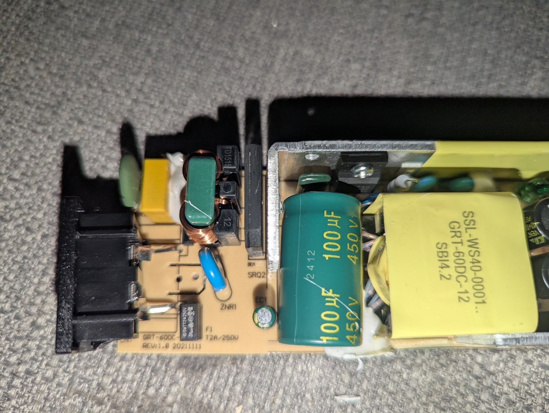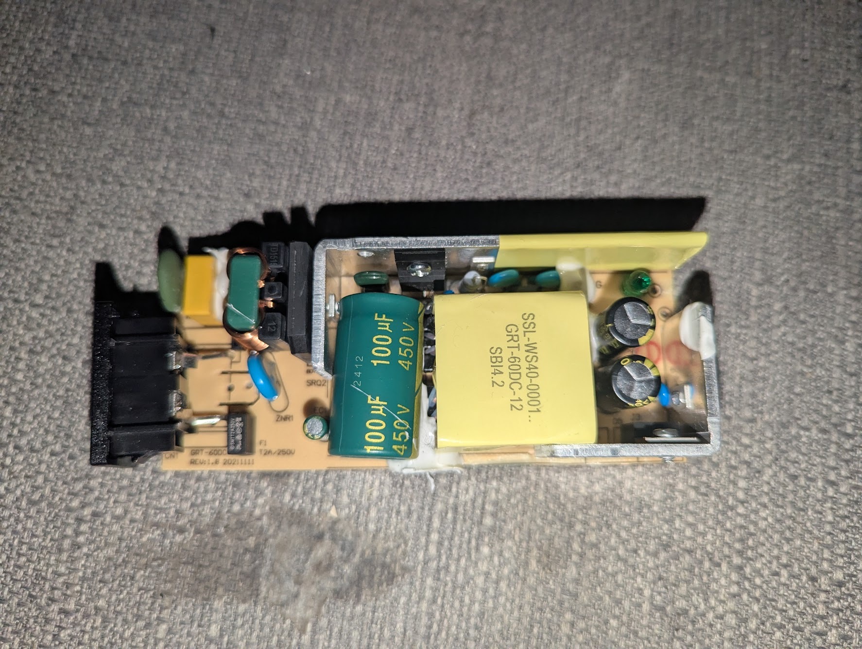 I bought an Alpicool C20 fridge, which is a 60W compressor fridge that runs on 12V or 24V, which can come from either an AC/DC adapter from mains (240V here in UK) or a car battery. The fridge itself is really good quality, so I was surprised to find the power supply (DC14.5V, 4.1A) pretty questionable. Despite being 240V/1.5A the plug was fitted with a 13A fuse - concerning, but not all that uncommon for imported chinese electronics here. But when I felt how light the brick was I immediately said hell no and transferred the proprietary connector to a MeanWell GS90A12-P1M brick (this supply is held together with screws rather than glue and the molded cable from the original PS fit nicely in the MeanWell).