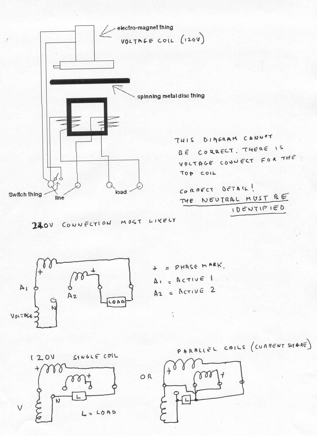 1. To change from 240V to 120V either the voltage coil must be tapped with three wires (this does not appear to be the case) or the current coils have to be re-arranged (the only apparent option). Current coils either in series or parallel as per my diagrams.