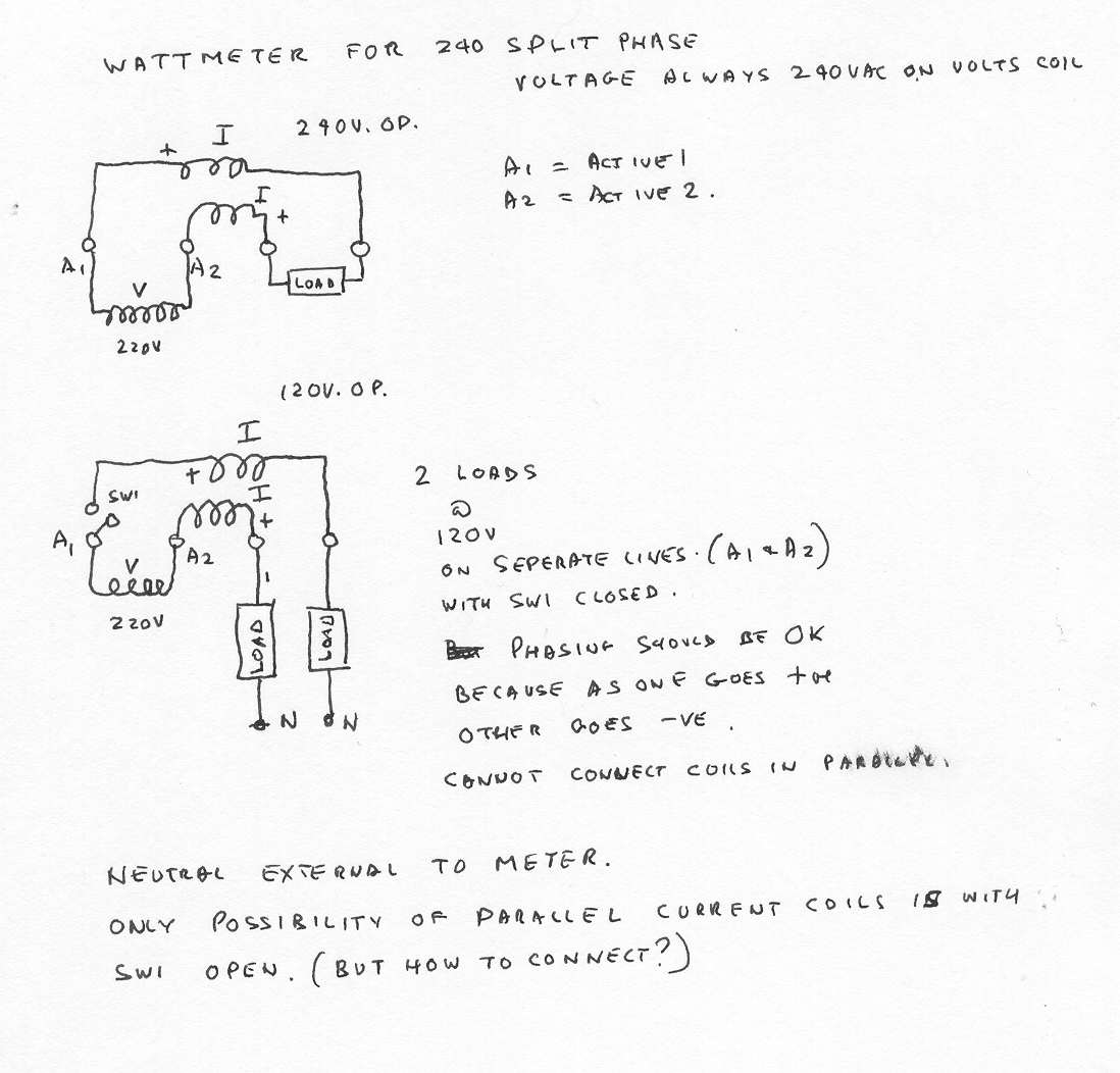 Starfury1 sent me a PM with a 240V split system picture. The split system rather than phases is well understood. However the PM made it clear that the neutral in an external connection and that the wattmeter voltage coil may always requires 240VAC. ie the meter always has 2 splits connected. This means that when connecting 120VAC devices they will be attached to a current coil on one of two splits. Each 120V device load is returned to neutral externally. (same config as for 240 but the load is split with the centre to neutral)