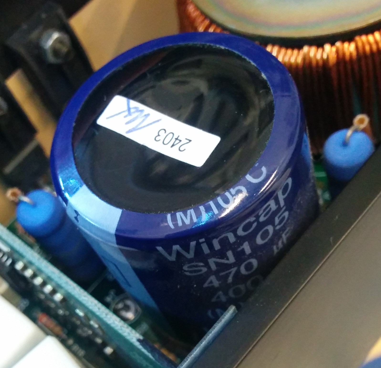 I've attached 2 pictures of the electrolytes. The blue one is definitely bulging, as I have another unit where the top is completely flat.
