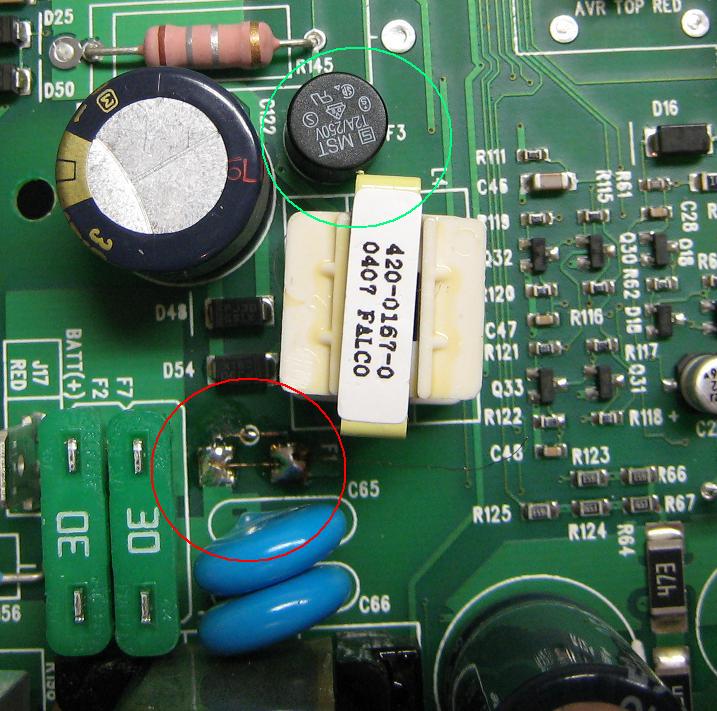 1. Fuses. F1 not only protectes components but if shorted with solder it can burn out a thin PCB track somewhere. The Green fuses look like blade fuses and need to be replaced by a new fuse of same rating. What is the current rating?
