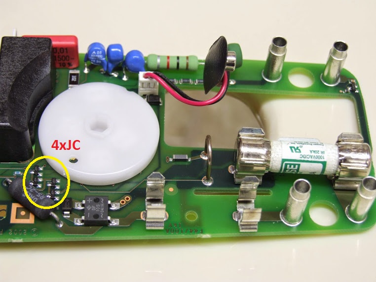 After opening, I have found some transistors looking components that are shorted, but not completely. At one of them, it seems like the green paint came off at one leg and in the same spot, seems like the trace has a damage as well(maybe missing transistor leg, hard to tell).