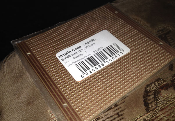 Now the stripboard is only good for 1 amp current, so my plan is to solder the relay on to the stripboard which will hold the relay physically in place, then solder the wires of the lamp directly to the load side pins of the relay (i.e. so that the relatively large current goes through the lamp's own 5 amp wire and not through the stripboard conductor). Then I plan to fix the circuit securely inside of the plastic enslosure.