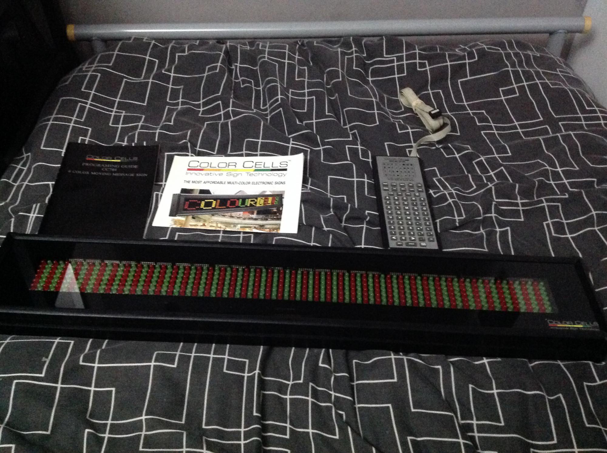 This unit is the Colour Cells CC784 Programmable Led Signboard, a very interesting one to. Its based off a shift register design with MC1413P Ics to select the Leds made in about 1989 so quite old. Comes with a remote which has letters on that you can type and programme for the display.