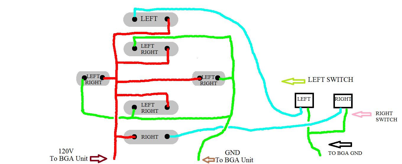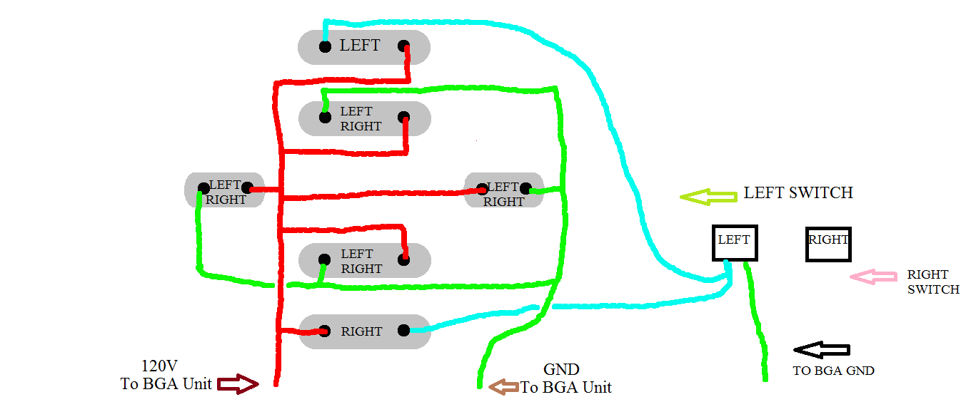 I wanted to try and figure out away to wire it up so when one of the switches is on, the top and bottom heating elements in the diagram are off (the outer right and left one in real life) and when that same switch is on, it turns on those outer heating elements. That way, I'd have a small board switch and a large board switch instead of a LEFT SWITCH and a RIGHT SWITCH.