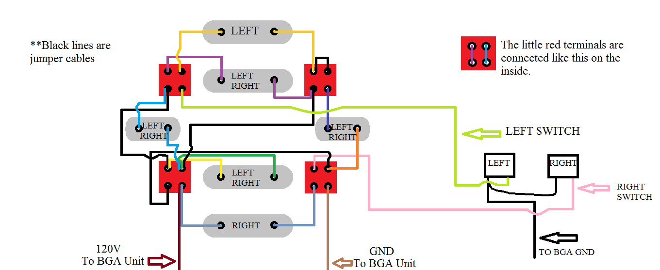 If there's anything else I can answer, please let me know. If you want, I can figure out exactly what those two "GND To BGA Unit" and "TO BGA GND" are actually connected to but it will probably involve taking the whole unit apart. There is a mess of wires inside and they're all crammed into these small, long plastic boxes that have this top that slides over it. Some sort of conduit but I think I've seen these used before with patch panels for networking and shit.