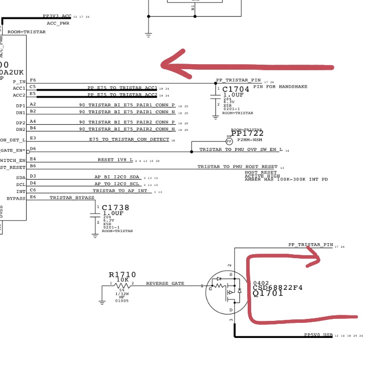 This is from an iPhone 6. I'm having a hard time understanding how q1401 controls the "handshake" to Tristar_pin to allow charging.
