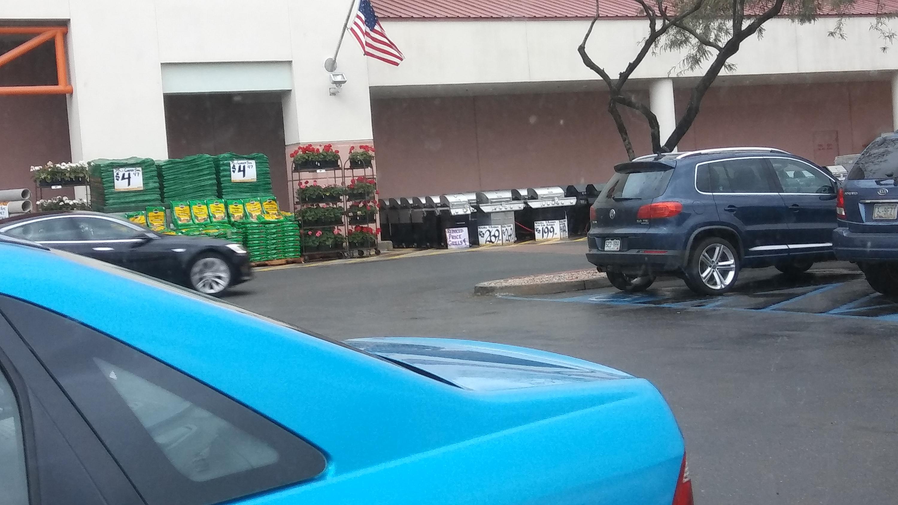 Over Home-depot one SUV parked in front of my car, look like Mazda CX-5, brand new with temporary paper licence plate, I read T...E..sla ?.....