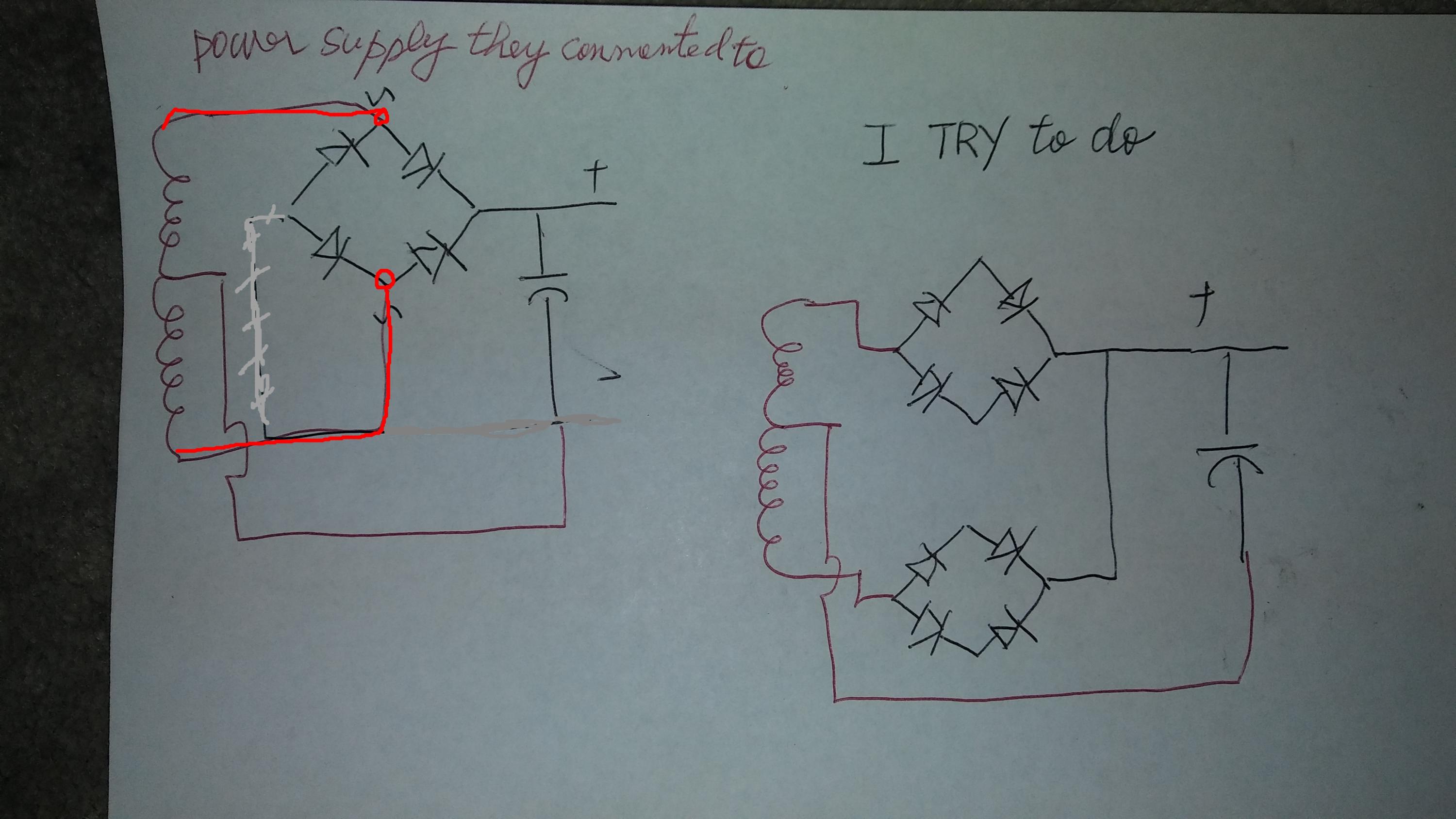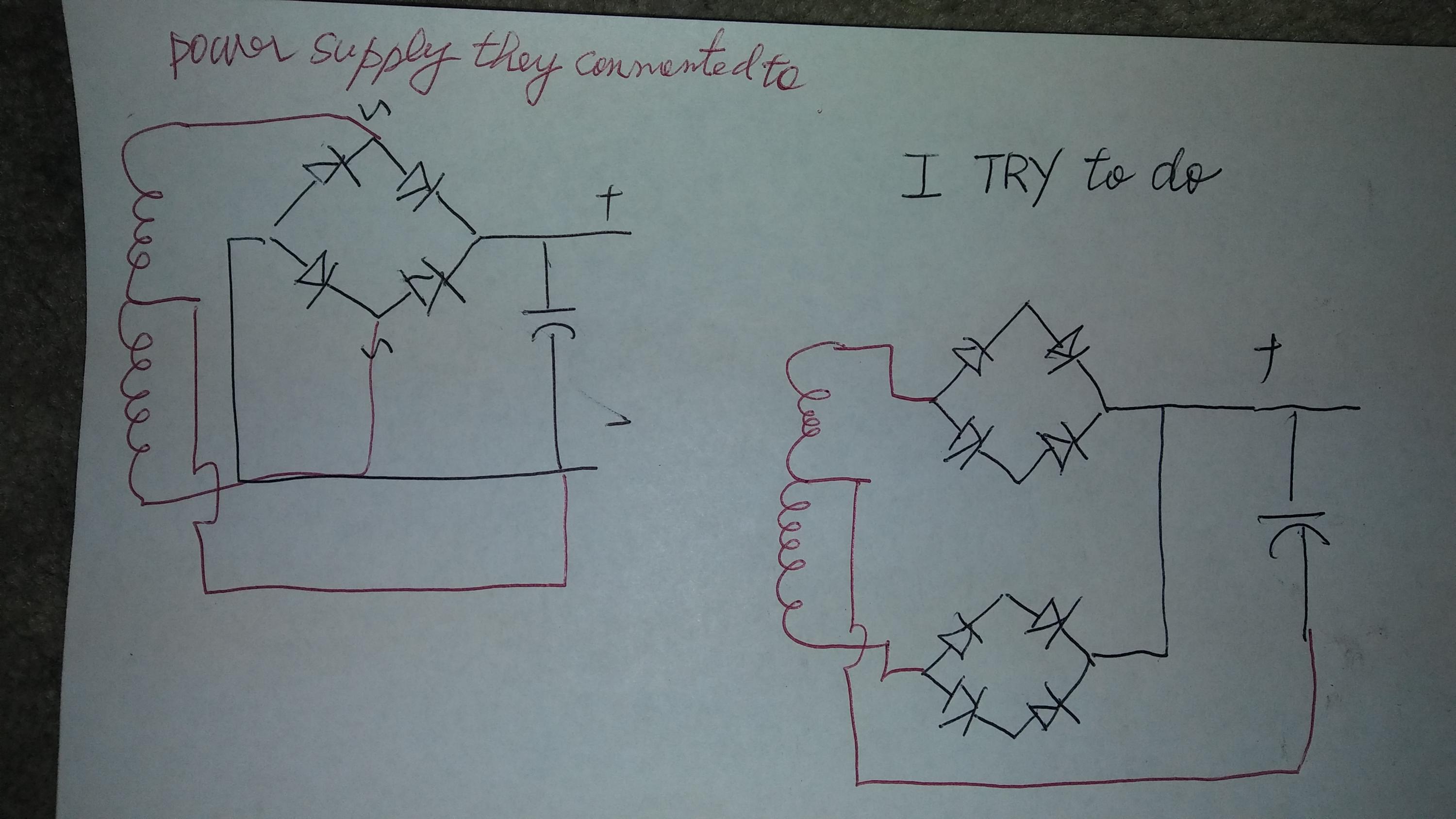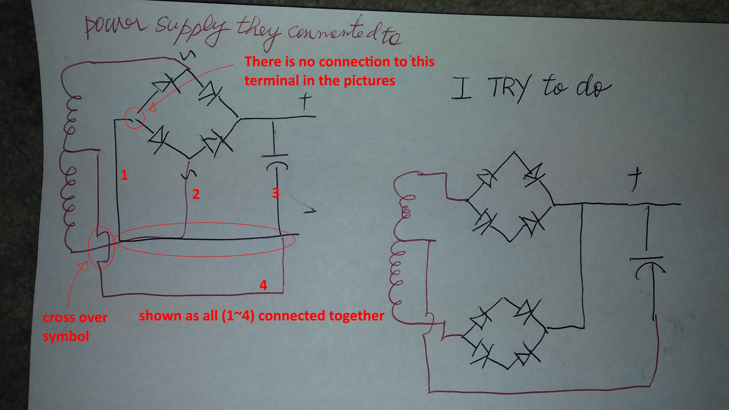 Left drawing is wrong, look at how many terminals on the bridge rectifier being used in the unit. Your drawing has the bottom winding shorted out.