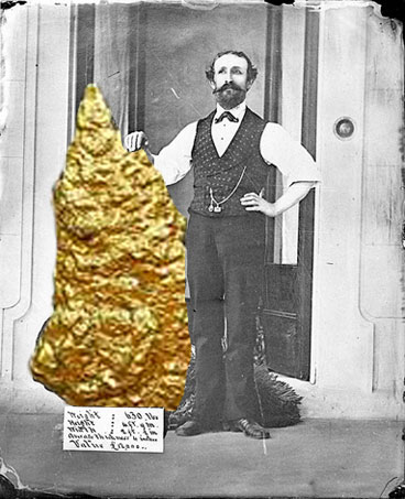 Holtermann with his "nugget" . Discovered at Hill End in 1872, the Holtermann Nugget remains the largest single mass of gold ever discovered in the world, measuring 1.5 metres long and weighing almost 290 kg.