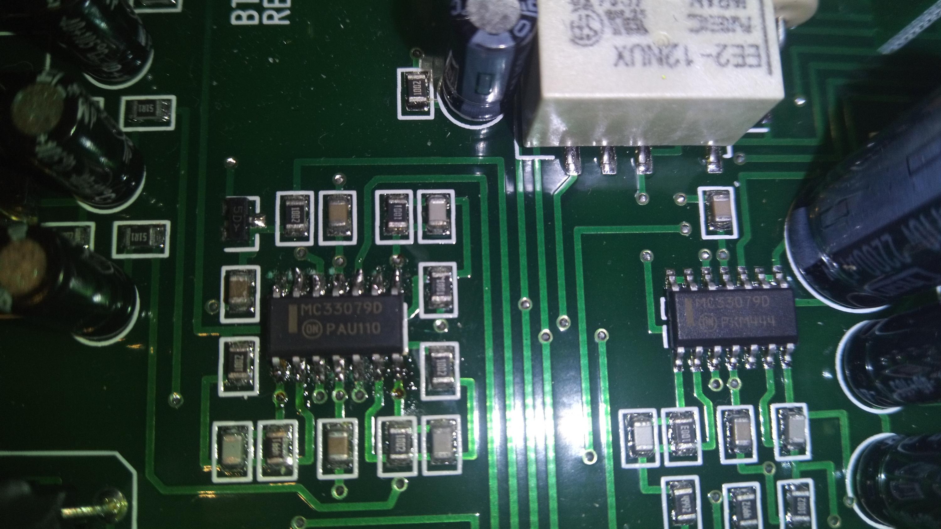 So I contacted the customer before opening it, and I was told that it was making a horrendous, fast paced clicking noise, and channel 1 was no longer functional. So I opened it up and found that the main MC33079D chip for the output had literally gone up in flames.