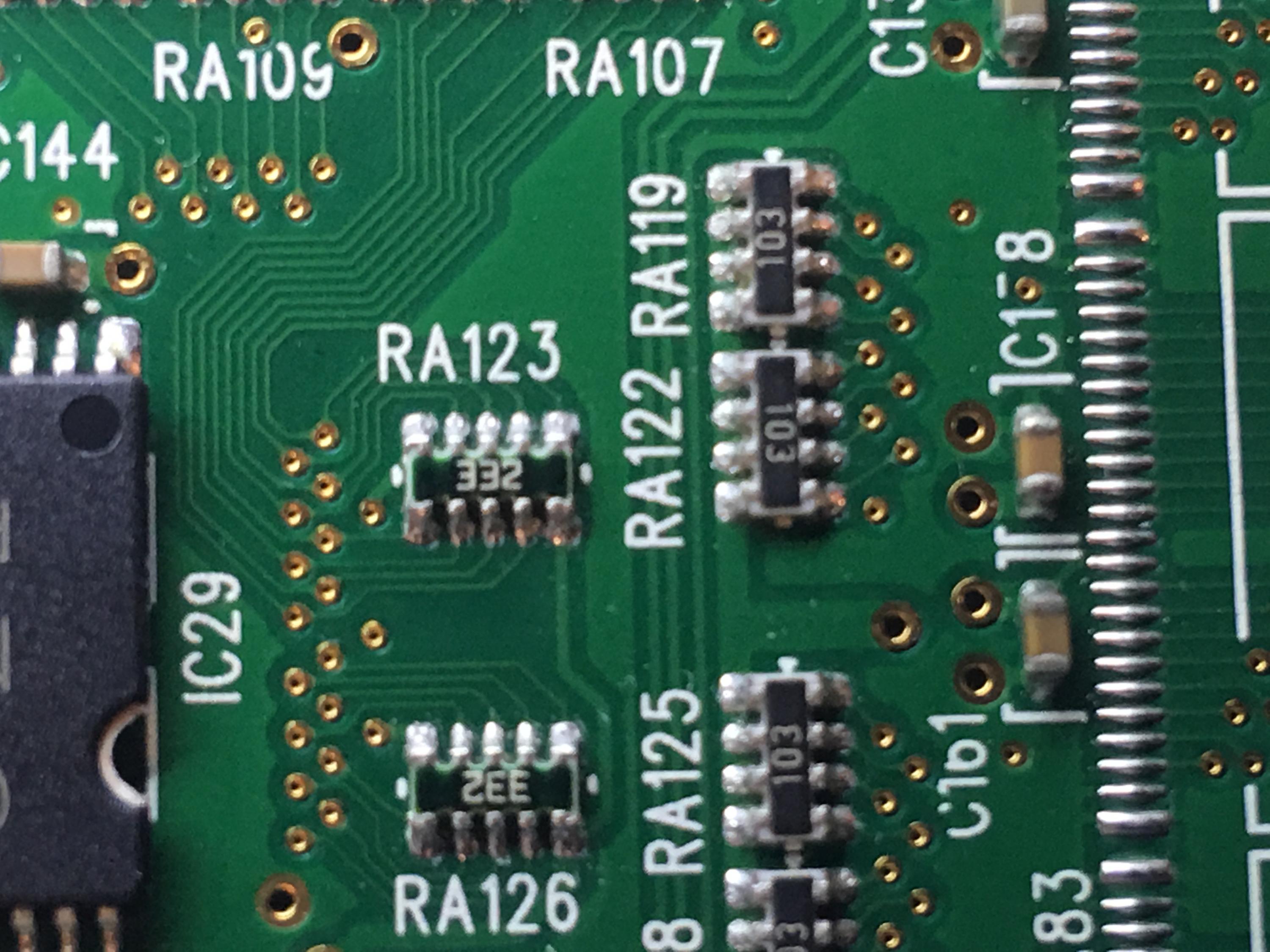 Hello - I am working on a professional keyboard Korg PA800 this is the CPU board and I need a better understanding as to identifying the resistor array. the resistor array is the RA123 or 126, the resistance I am getting across the pins is 2.841,6.63,6.61,6.64,3.220 when I switch the leads around I get the reading at the same points of 3.231,6.63,6.61,6.64,2.826. My questions is two fold, first is the resistance out of tolerance , and it could be worse under load, and what would this resistor be called if I need to order another one? I know the marking 332 is a 3.3 Kohm but it is doubling after the first resistor.