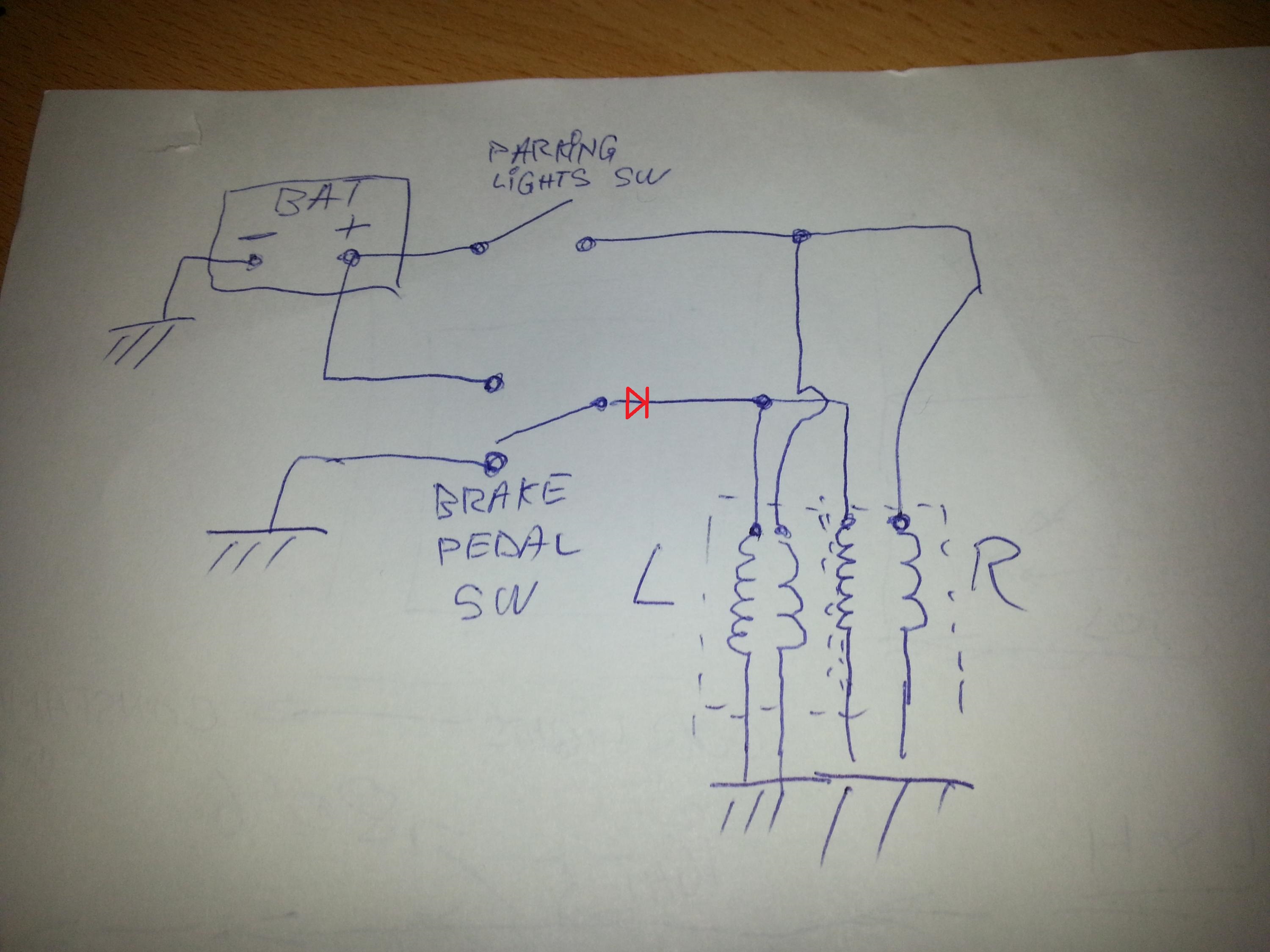 on the bench trying to replicate the one in the car as closely as possible: regular dual filament bulb in parallel with LED lamp with diode. I connected both filaments in the dual filament bulb to + straight off the adapter to simulate both the parker and the brake being pressed (no diode in between) then connected the parker terminal of the LED bulb to the adapter directly (no diode here either) then the brake terminal through the diode as well and it works: the LED lamp becomes brighter when I touch the cathode of the diode to the brake terminal...great....so why the hell isn't it working in the car ?