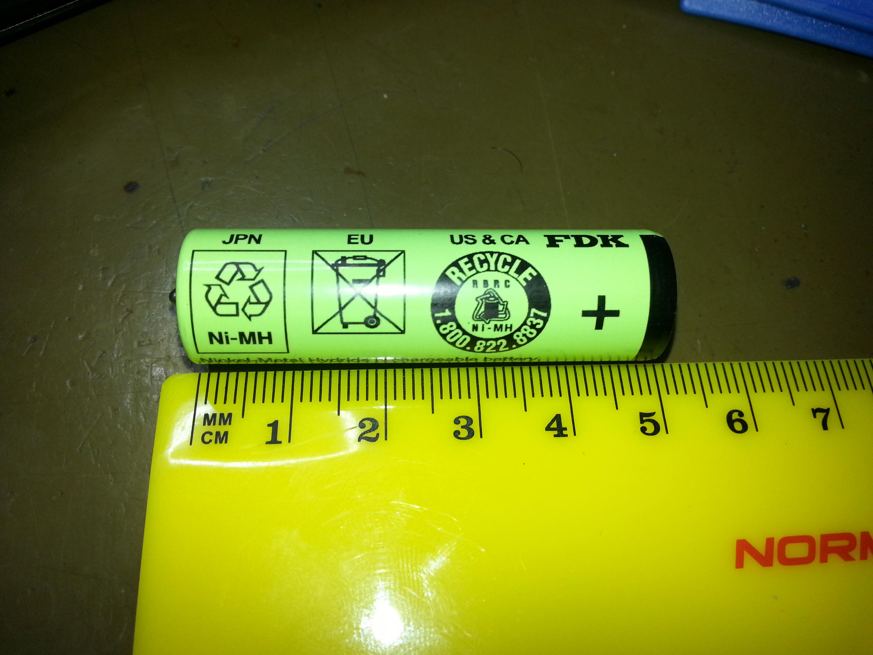 After a lot of effort, since it's waterproof and sealed very tightly, I managed to finally crack the shaver open and get to the batteries buried deep inside. Being that it's a fairly modern device, I was expecting to find a lithium battery in there, but instead I was met by THESE....I though "ok, simple enough. AA NiMh batteries, but then I had a closer look at them and there's a catch: literally, there's a catch at each end They're the most bizarre things ever and as far as I'm concerned they may very well exist in just this one device only. The cell has got two little nipples at each end which engage with some clips in the holder to hold the batteries and also make contact. Outside of that, they're identical in size to AA batteries, but I just couldn't come up with a good (enough) idea of holding them in there, because there's no springs like in normal AA holders - they rely solely on those metal "snaps" to hold them in there, so a regular AA would just fall out, even though I'm sure it would work just fine electrically. I was thinking of shoehorning a washer or something in there, but it wouldn't stay put...my local electronics store WAS able to identify these cells and source them for me, but the price was rather high and I wasn't sure it was worth it, so I thought I'd do some digging on my own. There's no specs on them either (as far as I remember at least, because I don't seem to have taken any pictures all around the label and I'm only assuming that's because there was no info in those areas).
