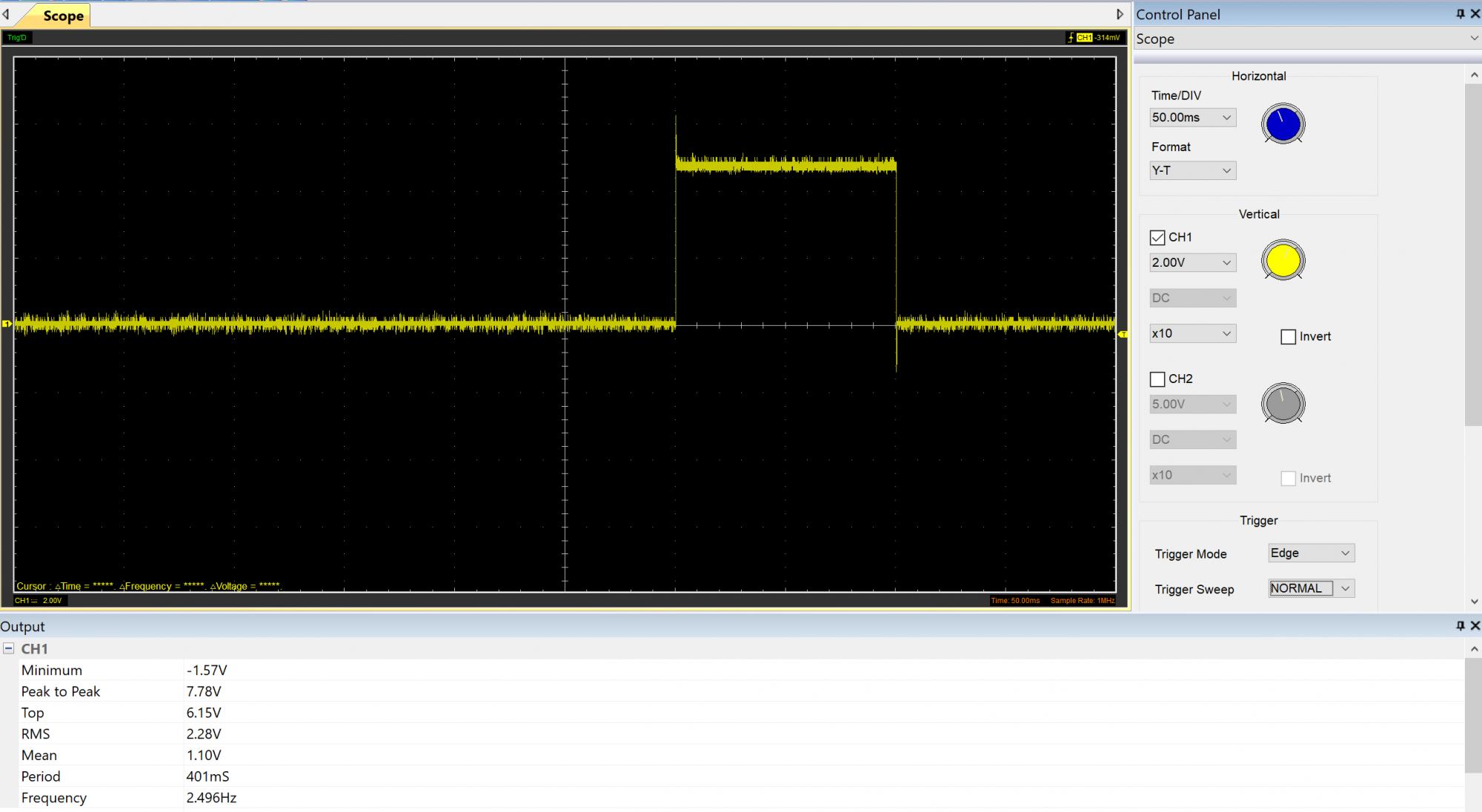 So out of curiosity, I connected my scope to a PWM output from an Arduino and I pulsed it at max value for a duration of 100ms on and 300ms off ... here is the output