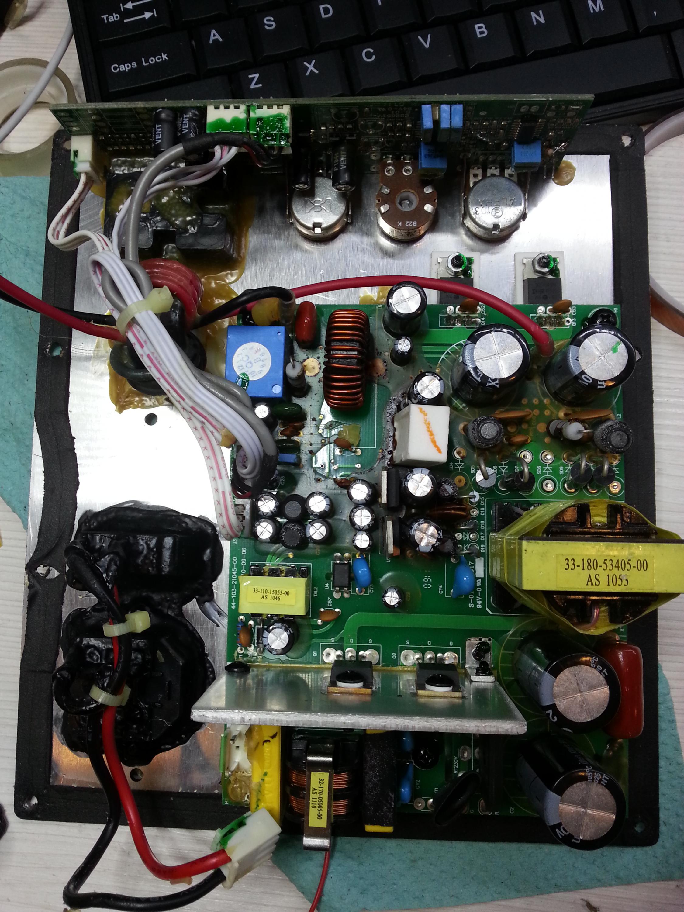 Ok, here's where we stand: I cleaned up some of the brown gunk and replaced a couple of caps, including one on the input board which seemed to have some orange stuff on the top and I attempted a power on. I plugged the supply in via a series lightbulb, the 15 and -15v rails went up and it seemed stable, with the bulb staying off all throughout.