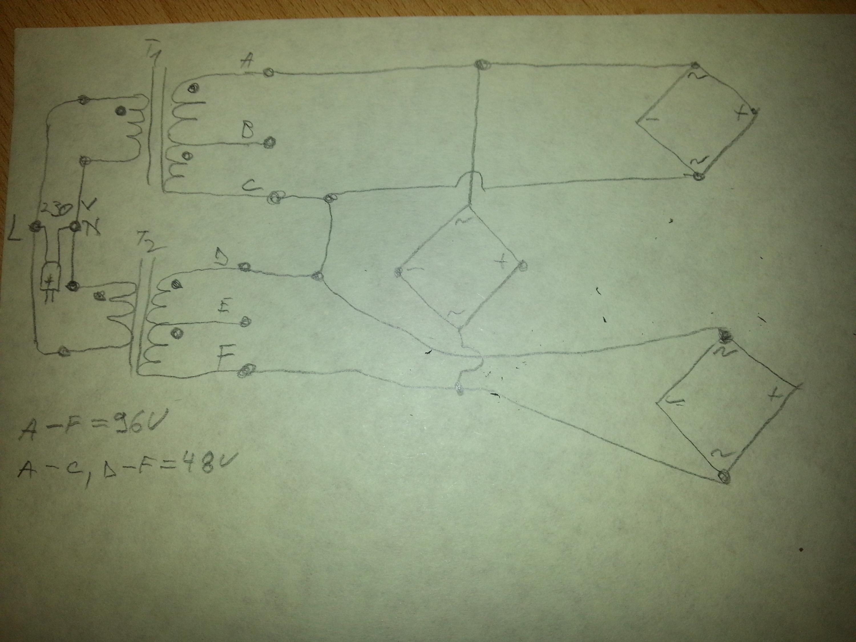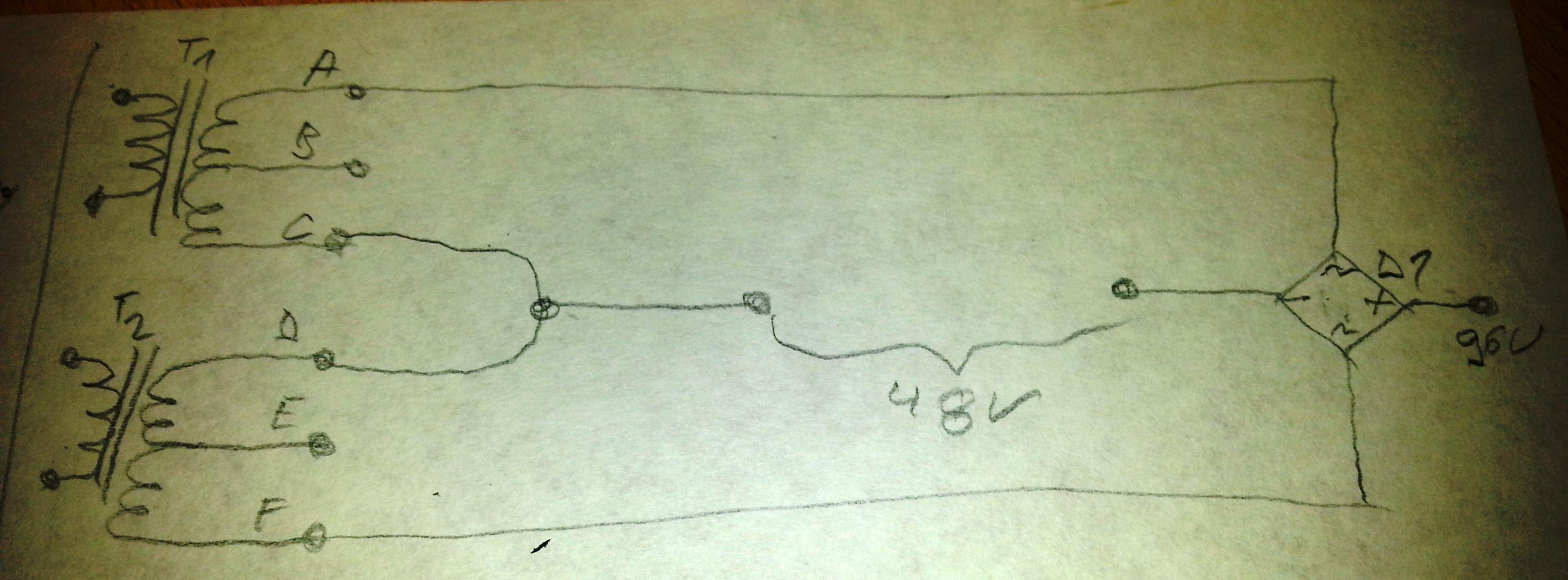 First, what if I wire the secondaries in series like in the schematic I drew...I know I know, there's no reason why I'd ever need an unregulated 96v output but if I have the option, why not. Would it work the way I drew it in addition to powering the modules ?