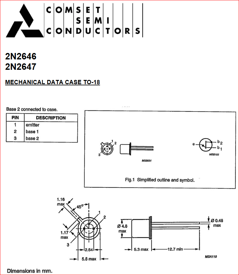 2N2646 pinout seems to be an oddball metal can, non-standard TO-18 case. TO-18 (UJT) so the tab is at a weird angle compared to the typical transistor TO-18 configuration. Note they use bottom view for pinouts on datasheets.