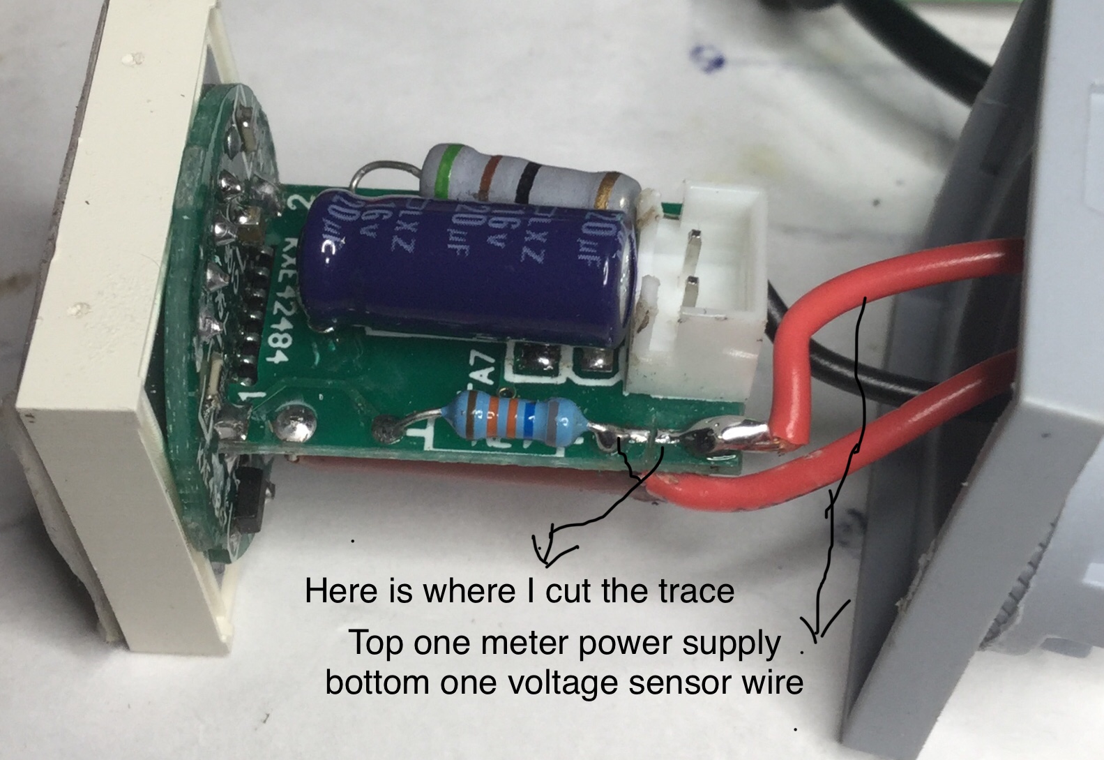 The modification to this board —> it shows where the 5 volt section for powering the meter so it can read down to ( [0] volts )