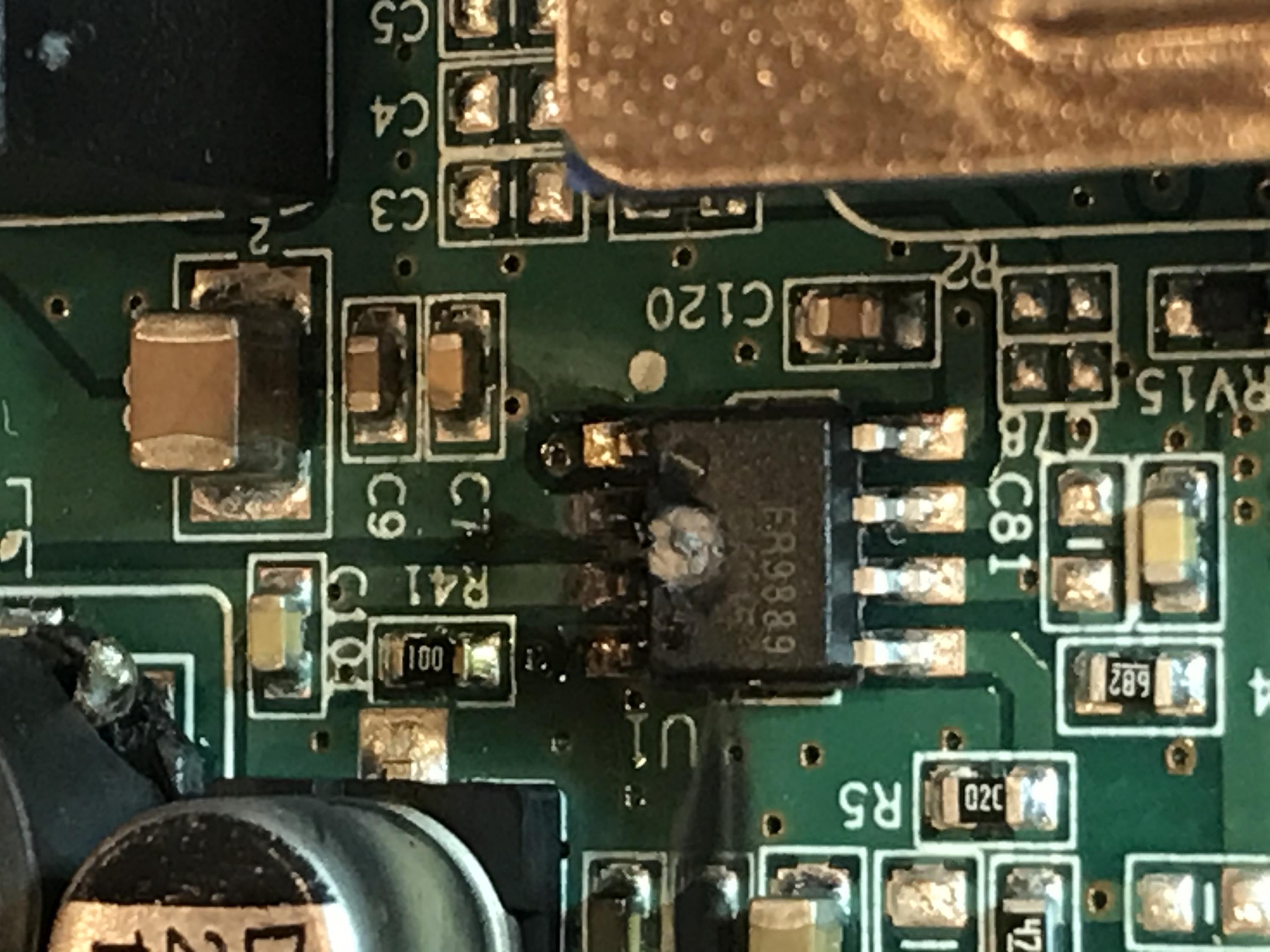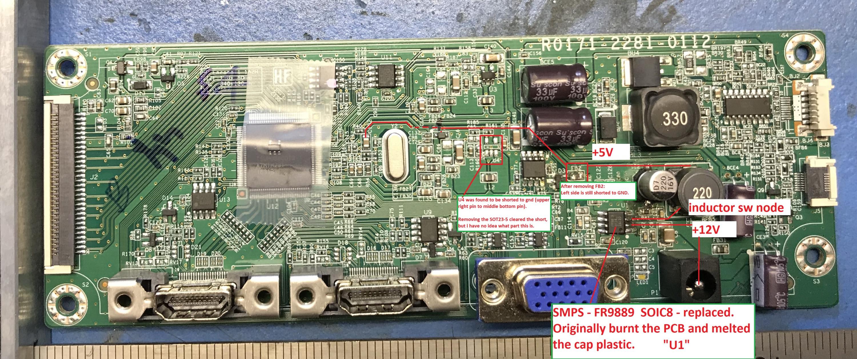 This comes from a hp monitor board R0171-2281-0112 on an "HP 27f" IPS display. The original owner of this display plugged in the wrong power adapter and the SMPS SOIC8 blew up and burnt some of the board fiberglass below. I found a replacement FR9889 SOIC and installed it at location U1, that got the +5.2V supply working.