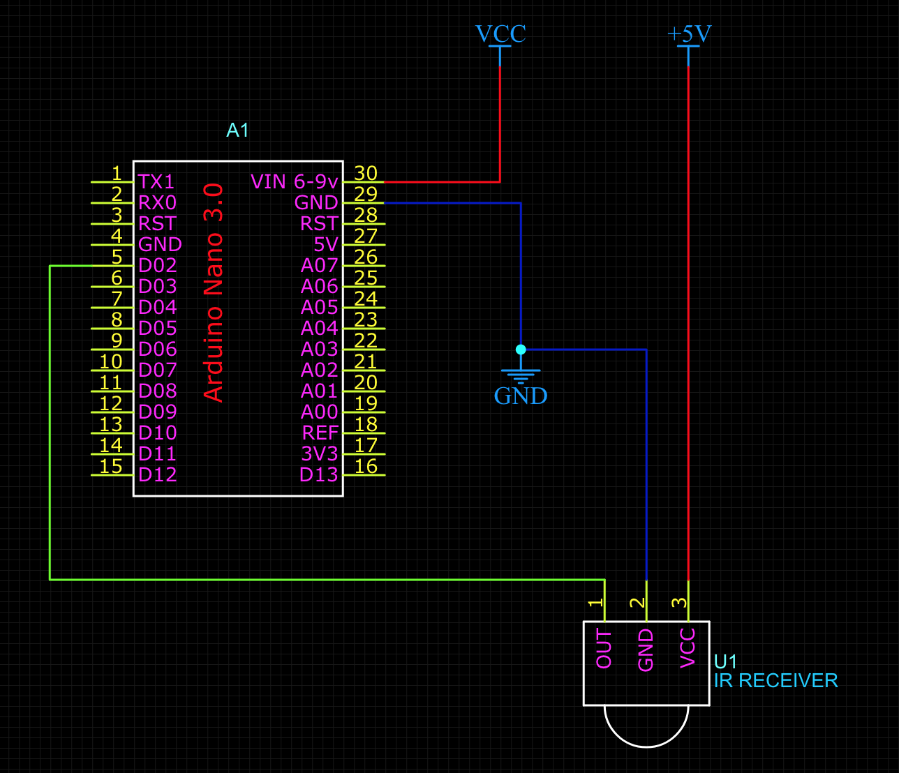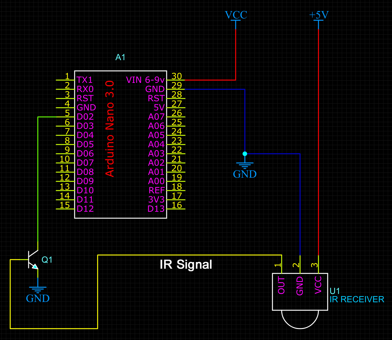 The IR Input pin is configured to idle in an INPUT_PULLUP mode, which means if nothing is connected to it, it will always be right around 5 volts, so I only need to pull it to ground when that IR sensor gets below 4 volts or so.