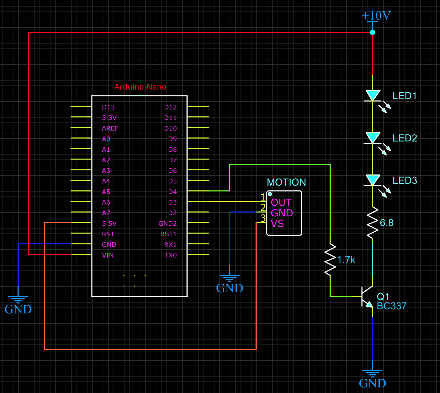 I made a small project where a motion sensor triggers an Arduino pin and when the pin from the motion sensor goes high, another pin that's connected directly to the base of a 2N3904 goes high, which switches some LEDs through a 10V source.
