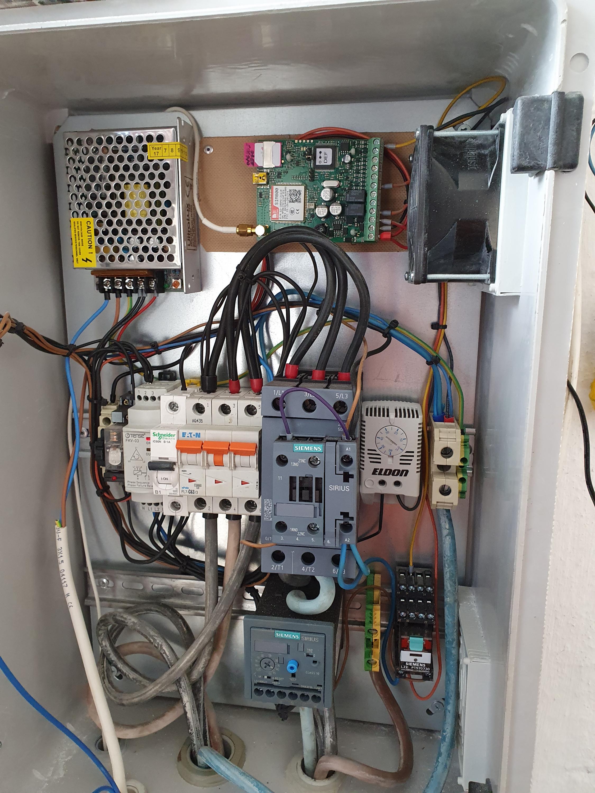 Down in the foothills where the pump shack is, there obviously IS constant 3 phase 400v utility power running our box, which is also much more involved: there's the main contactor, an overload switch, a phase monitoring relay and a handful of different goodies for me to play with.
