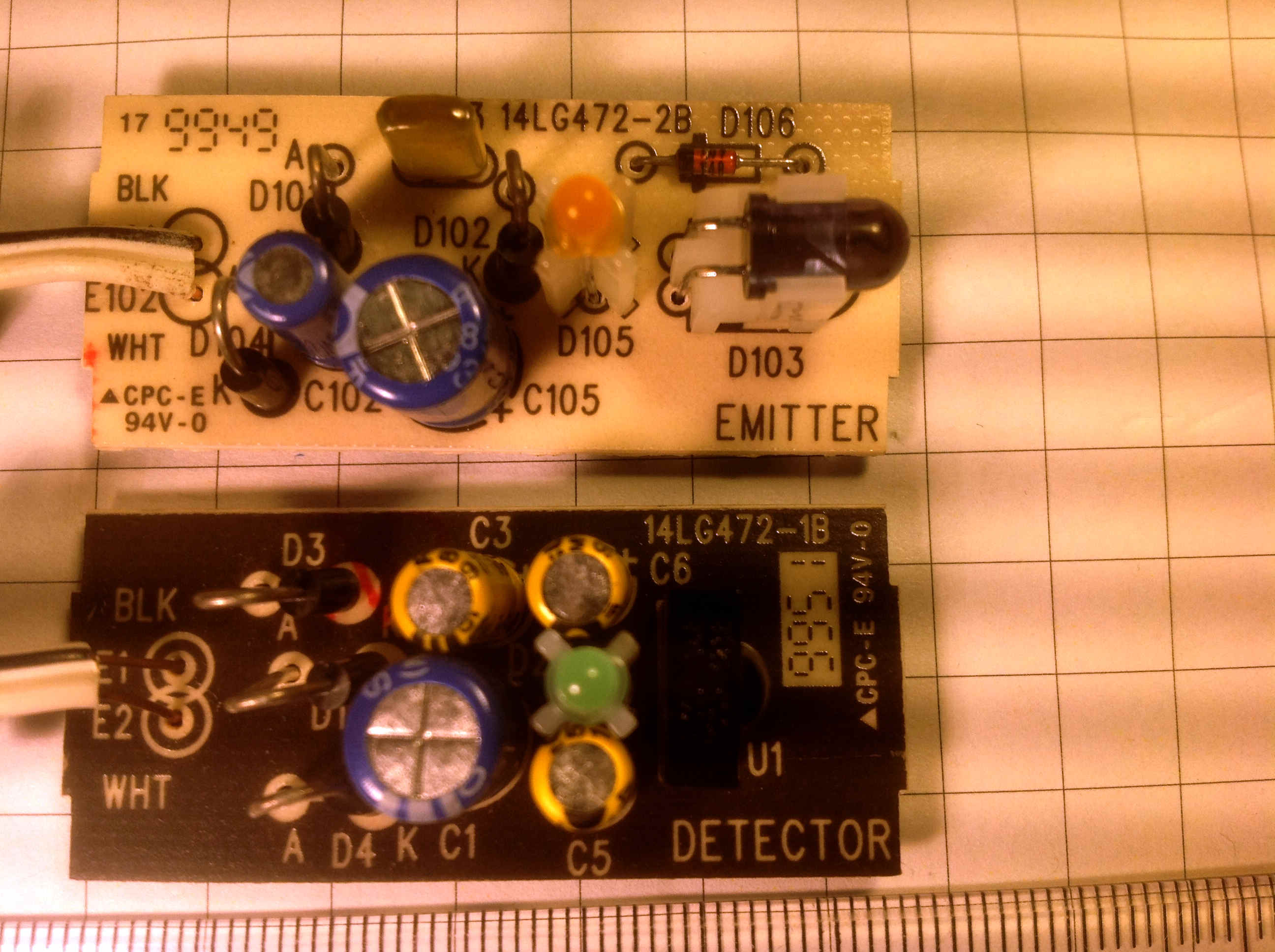 Agreed. Is likely the LED. I see there are 2 primary LIGHT frequencies for IR leds (unless I can find a marking on teh IR LED) so I need to either try both wavelengths or see which one the IR receiver uses. it is a TPMS5380 receiver (38khz). I did have to replace a 6.2V zener on the supply so I wanted to check this one for proper voltage.Comment