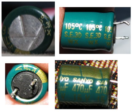 Hey guys I'm new here so I need you guy's opinion on some capacitors I bought off eBay. I have seen many Sanyo capacitors with K & T top and crooked "+" vents with dumbell and T bungs. The ones I bought were completely different from the one's I've seen on this forum. The bungs (bottom) were the same as the CapXon capacitors that I will be replacing. I just don't want to take any chance with inferior capacitors. Here are some images: