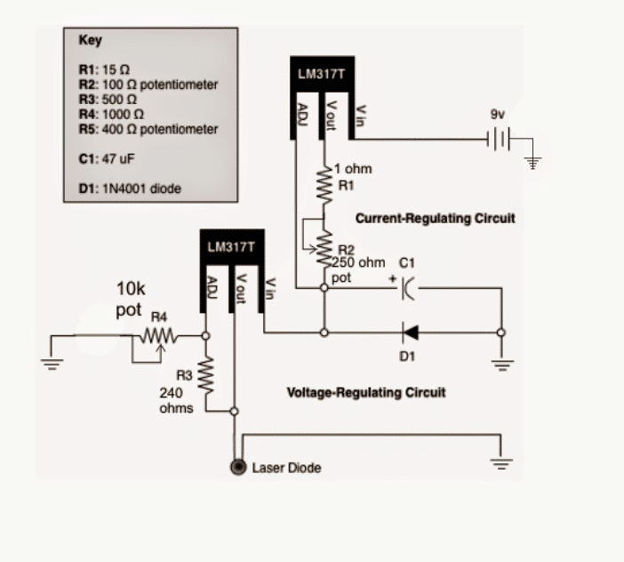 The input supply source is connected across the Vin and ground of the upper current regulator circuit, the output from this stage goes to the input of the lower LM317 variable voltage regulator stage. Basically both the stages are connected in series for implementing a complete foolproof voltage and current regulation for the connected load which is a laser diode in the present case.