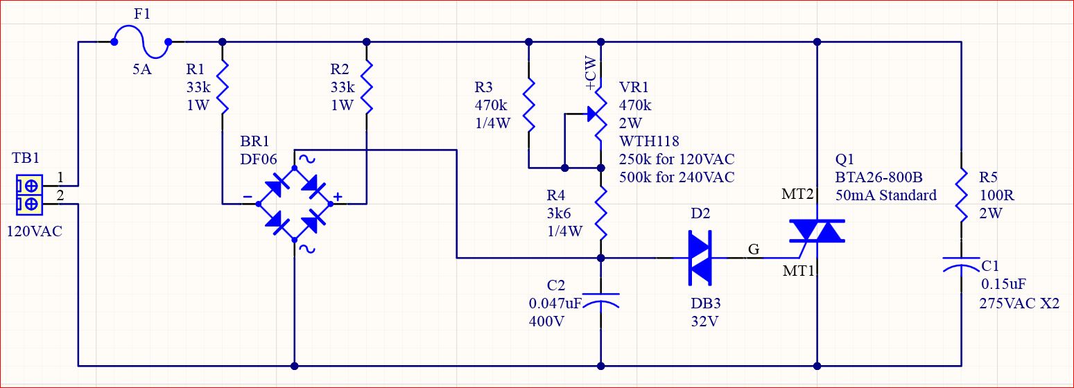 The dimmer was less than ideal: other than the fact that the motor slowed down considerably as soon as I moved the slider a small fraction, which made the slider virtually useless, the motor buzzed quite noticeably and I was afraid to let it run like this for too long, fearing the triac might pop.