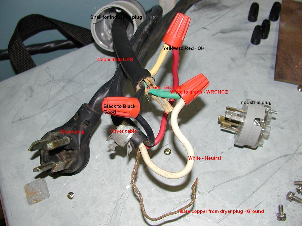 Either we have a failure to communicate, you don't understand wiring principles, you have gremlins at your house, or you are trying to bullshit me. Take a look at the picture. The Green wire from the UPS is ground. SOMEONE hooked the white wire from the dryer cord to it. You don't need a neutral wire, you need a ground wire for safety.